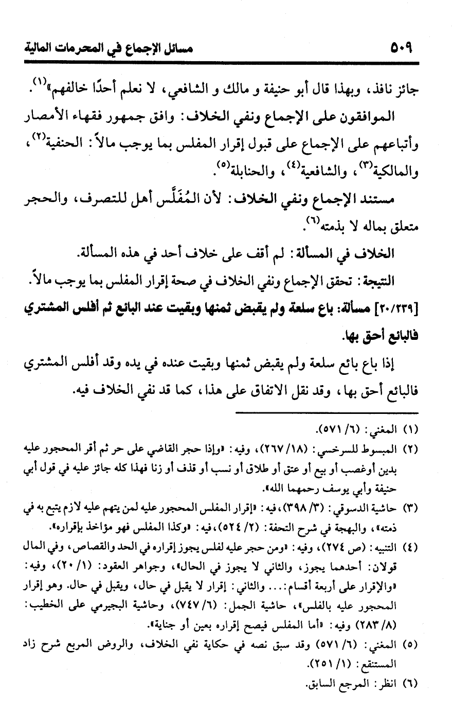 • الموافقون على الإجماع ونفي الخلاف: وافق جمهور فقهاء الأمصار وأتباعهم على الإجماع على قبول إقرار المفلس بما يوجب مالًا: الحنفية (¬2)، والمالكية (¬3)، والشافعية (¬4)، والحنابلة (¬5).