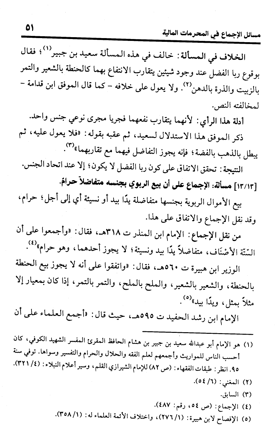 • الخلاف في المسألة: خالف في هذه المسألة سعيد بن جبير (¬1)؛ فقال بوقوع ربا الفضل عند وجود شيئين يتقارب الانتفاع بهما كالحنطة بالشعير والتمر بالزيت والذرة بالدهن (¬2). ولا يعول على خلافه -كما قال الموفق ابن قدامة- لمخالفته النص.