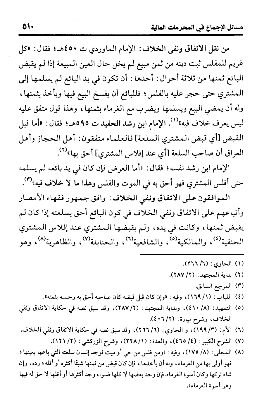 • من نقل الاتفاق ونفى الخلاف: الإمام الماوردي ت 450 هـ؛ فقال: "كل غريم للمفلس ثبت دينه من ثمن مبيع لم يخل حال العين المبيعة إذا لم يقبض البائع ثمنها من ثلاثة أحوال: أحدها: أن تكون في يد البائع لم يسلمها إلى المشتري حتى حجر عليه بالفلس؛ فللبائع أن يفسخ البيع فيها ويأخذ بثمنها، وله أن يمضي البيع ويسلمها ويضرب مع الغرماء بثمنها، وهذا قول متفق عليه ليس يعرف خلاف فيه" (¬1). الإمام ابن رشد الحفيد ت 595 هـ؛ فقال: "أما قبل القبض [أي قبض المشتري السلعة] فالعلماء متفقون: أهل الحجاز وأهل العراق أن صاحب السلعة [أي عند إفلاس المشتري] أحق بها" (¬2).