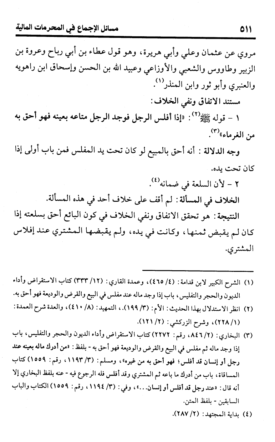 (¬1) الشرح الكبير لابن قدامة: (4/ 465)، وعمدة القاري: (12/ 333) كتاب الاستقراض وأداء الديون والحجر والتفليس، باب إذا وجد ماله عند مفلس في البيع والقرض والوديعة فهو أحق به.