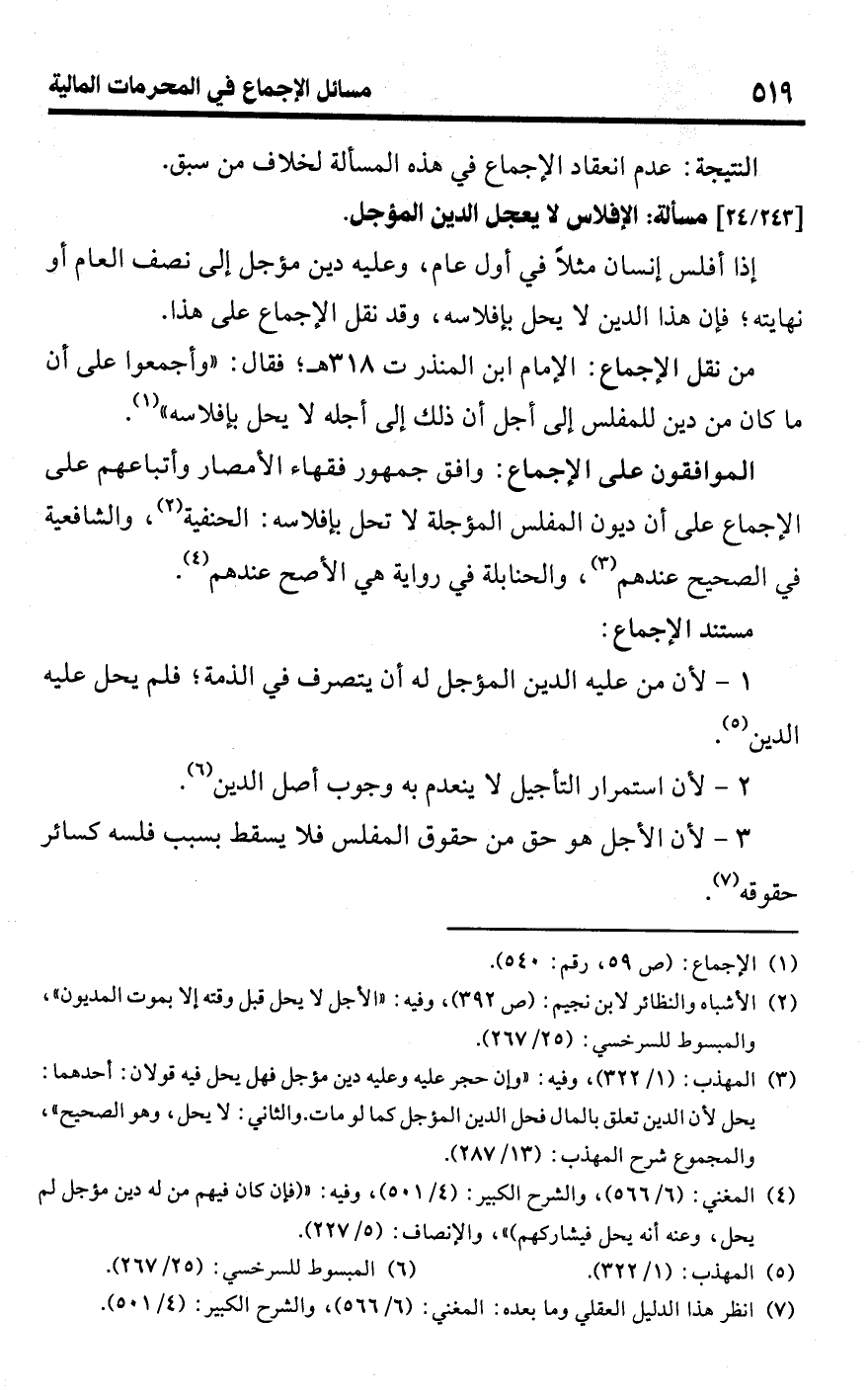 • من نقل الإجماع: الإمام ابن المنذر ت 318 هـ؛ فقال: "وأجمعوا على أن ما كان من دين للمفلس إلى أجل أن ذلك إلى أجله لا يحل بإفلاسه" (¬1).