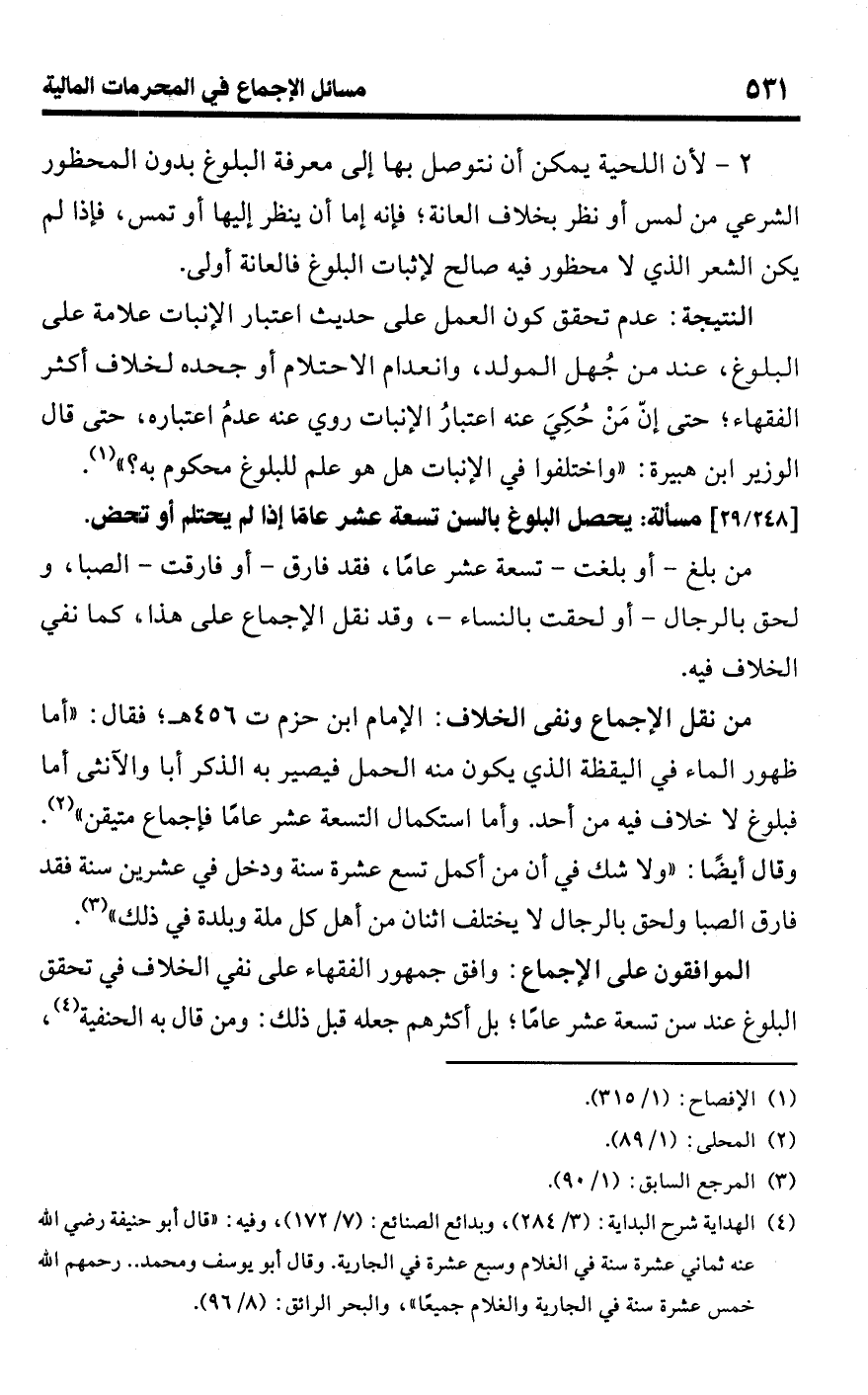 • من نقل الإجماع ونفى الخلاف: الإمام ابن حزم ت 456 هـ؛ فقال: "أما ظهور الماء في اليقظة الذي يكون منه الحمل فيصير به الذكر أبا والأنثى أما فبلوغ لا خلاف فيه من أحد. وأما استكمال التسعة عشر عامًا فإجماع متيقن" (¬2). وقال أيضًا: "ولا شك في أن من أكمل تسع عشرة سنة ودخل في عشرين سنة فقد فارق الصبا ولحق بالرجال لا يختلف اثنان من أهل كل ملة وبلدة في ذلك" (¬3).