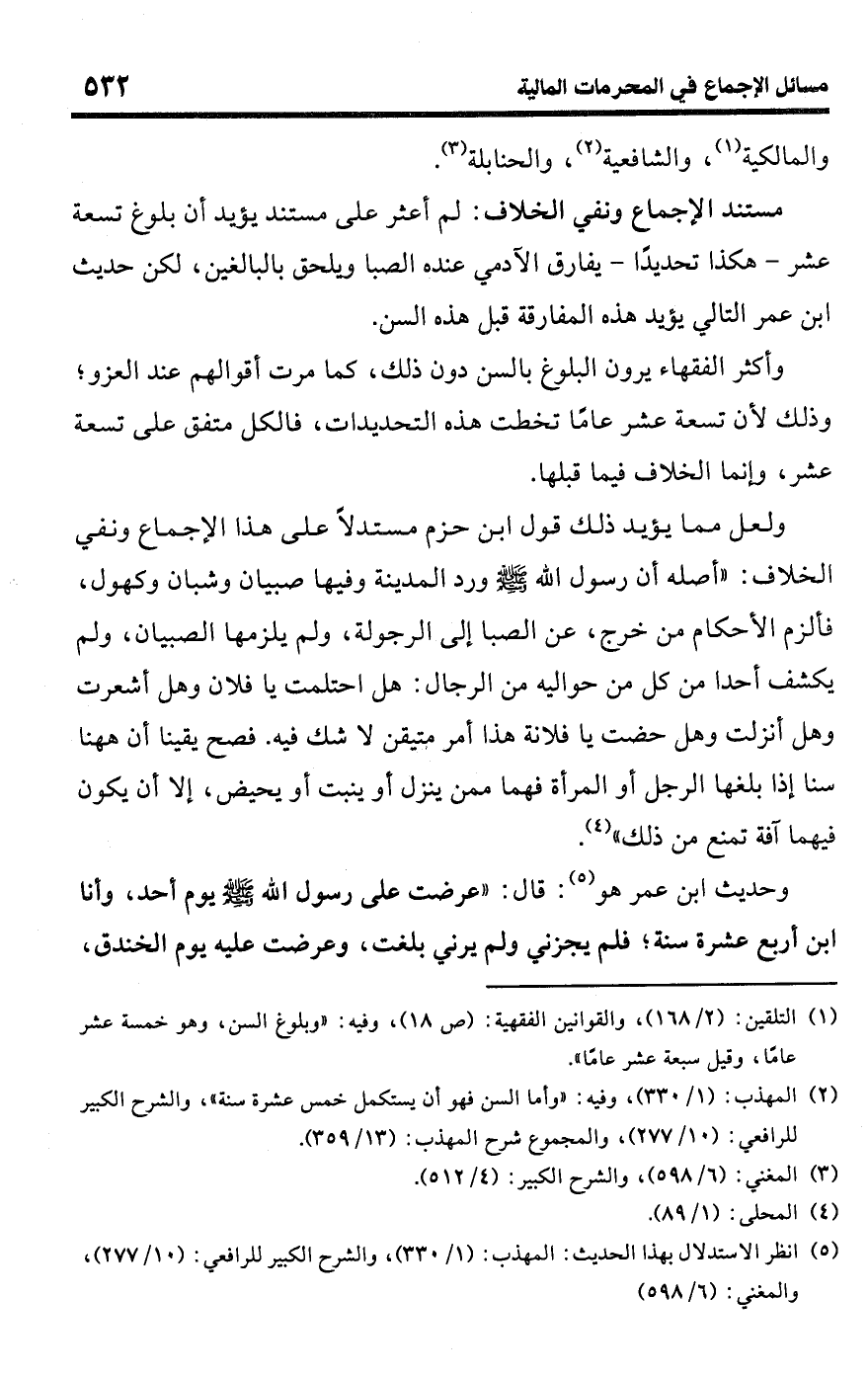 ولعل مما يؤيد ذلك قول ابن حزم مستدلًا على هذا الإجماع ونفي الخلاف: "أصله أن رسول اللَّه -صلى اللَّه عليه وسلم- ورد المدينة وفيها صبيان وشبان وكهول، فألزم الأحكام من خرج، عن الصبا إلى الرجولة، ولم يلزمها الصبيان، ولم يكشف أحدا من كل من حواليه من الرجال: هل احتلمت يا فلان وهل أشعرت وهل أنزلت وهل حضت يا فلانة هذا أمر متيقن لا شك فيه. فصح يقينا أن هاهنا سنا إذا بلغها الرجل أو المرأة فهما ممن ينزل أو ينبت أو يحيض، إلا أن يكون فيهما آفة تمنع من ذلك" (¬4).