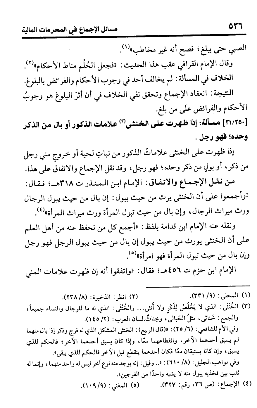 • الخلاف في المسألة: لم يخالف أحد في وجوب الأحكام والفرائض بالبلوغ.Rانعقاد الإجماع وتحقق نفي الخلاف في أن أثرَ البلوغ هو وجوبُ الأحكام والفرائض على من بلغ.