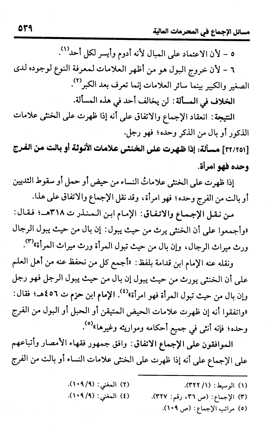 • من نقل الإجماع والاتفاق: الإمام ابن المنذر ت 318 هـ؛ فقال: "وأجمعوا على أن الخنثى يرث من حيث يبول: إن بال من حيث يبول الرجال ورث ميراث الرجال، وإن بال من حيث تبول المرأة ورث ميراث المرأة" (¬3).