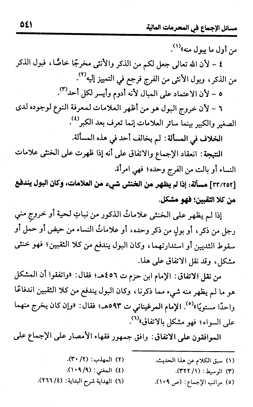 • من نقل الاتفاق: الإمام ابن حزم ت 456 هـ؛ فقال: "واتفقوا أن المشكل هو ما لم يظهر منه شيء مما ذكرنا، وكان البول يندفع من كلا الثقبين اندفاعًا واحدًا مستويًا" (¬5). الإمام المرغيناني ت 593 هـ؛ فقال: "وإن كان يخرج منهما على السواء؛ فهو مشكل بالاتفاق" (¬6).