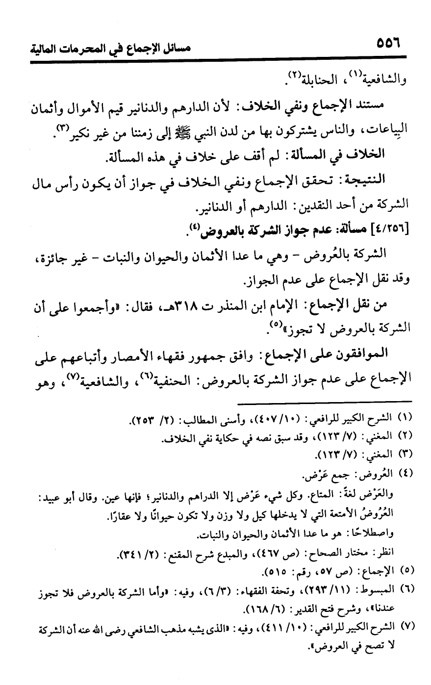 • من نقل الإجماع: الإمام ابن المنذر ت 318 هـ، فقال: "وأجمعوا على أن الشركة بالعروض لا تجوز" (¬5).