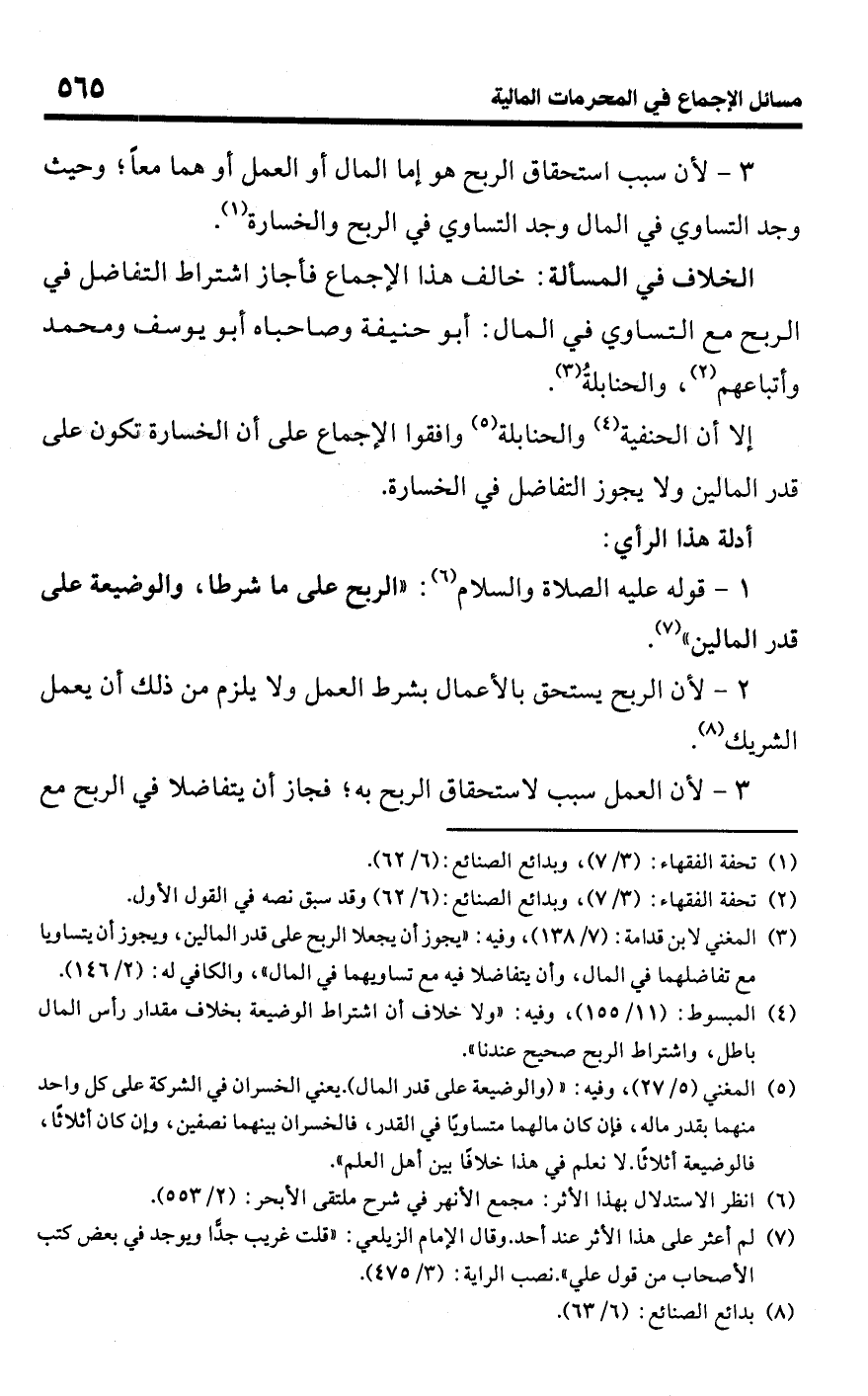 • الخلاف في المسألة: خالف هذا الإجماع فأجاز اشتراط التفاضل في الربح مع التساوي في المال: أبو حنيفة وصاحباه أبو يوسف، ومحمد وأتباعهم (¬2)، والحنابلةُ (¬3).