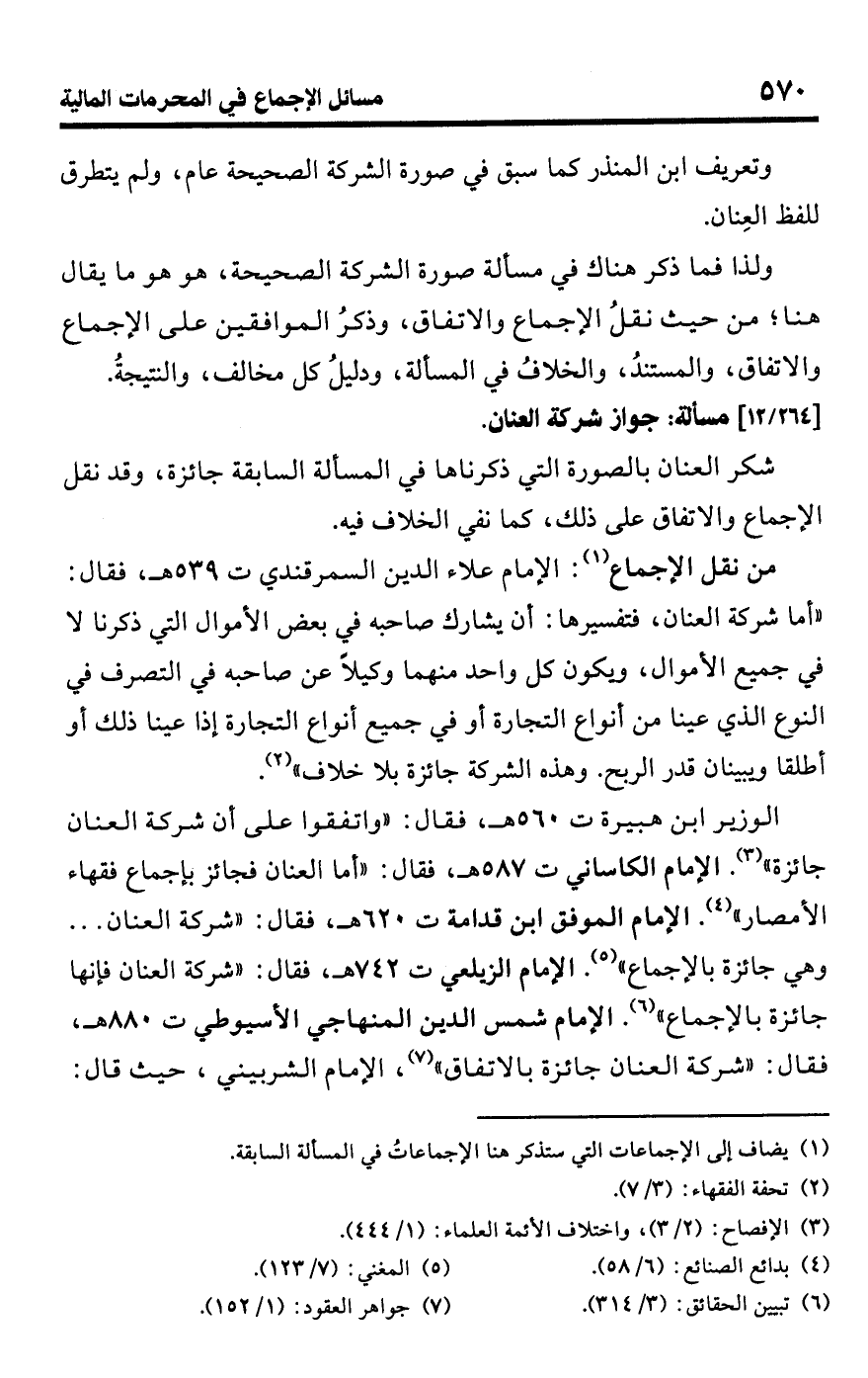 الوزير ابن هبيرة ت 560 هـ، فقال: "واتفقوا على أن شركة العنان جائزة" (¬3). الإمام الكاساني ت 587 هـ، فقال: "أما العنان فجائز بإجماع فقهاء الأمصار" (¬4). الإمام الموفق ابن قدامة ت 620 هـ، فقال: "شركة العنان. . . وهي جائزة بالإجماع" (¬5). الإمام الزيلعي ت 742 هـ، فقال: "شركة العنان فإنها جائزة بالإجماع" (¬6). الإمام شمس الدين المنهاجي الأسيوطي ت 880 هـ، فقال: "شركة العنان جائزة بالاتفاق" (¬7)، الإمام الشربيني، حيث قال: