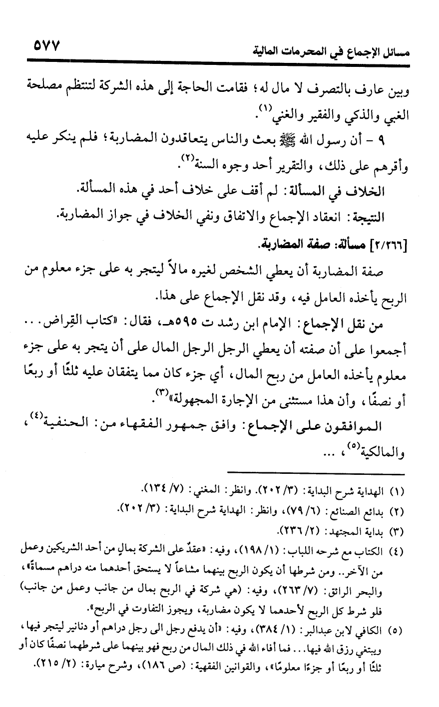 • من نقل الإجماع: الإمام ابن رشد ت 595 هـ، فقال: "كتاب القراض. . . أجمعوا على أن صفته أن يعطي الرجل الرجل المال على أن يتجر به على جزء معلوم يأخذه العامل من ربح المال، أي جزء كان مما يتفقان عليه ثلثًا أو ربعًا أو نصفًا، وأن هذا مستثنى من الإجارة المجهولة" (¬3).