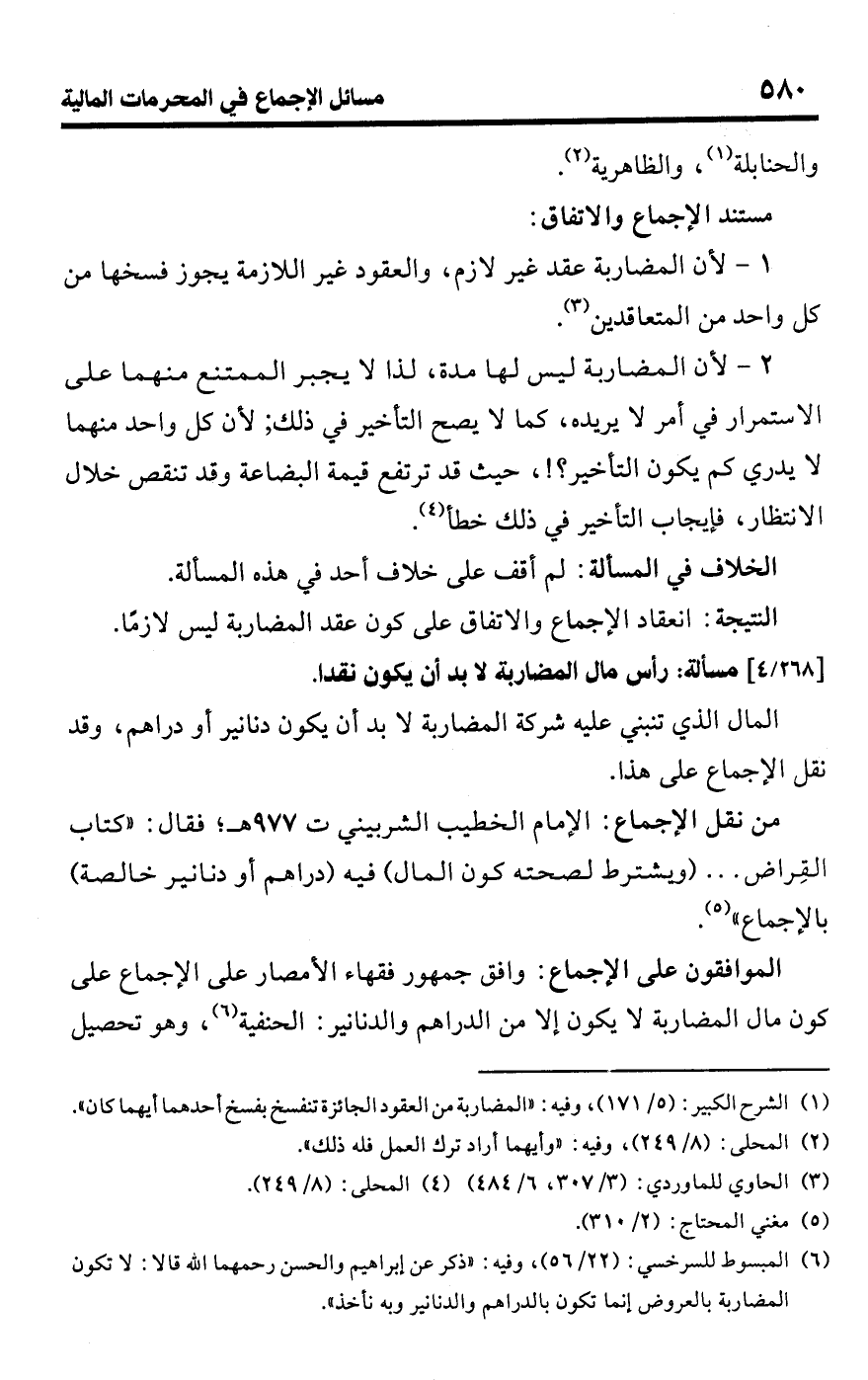 • من نقل الإجماع: الإمام الخطيب الشربيني ت 977 هـ؛ فقال: "كتاب القِراض. . . (ويشترط لصحته كون المال) فيه (دراهم أو دنانير خالصة) بالإجماع" (¬5).