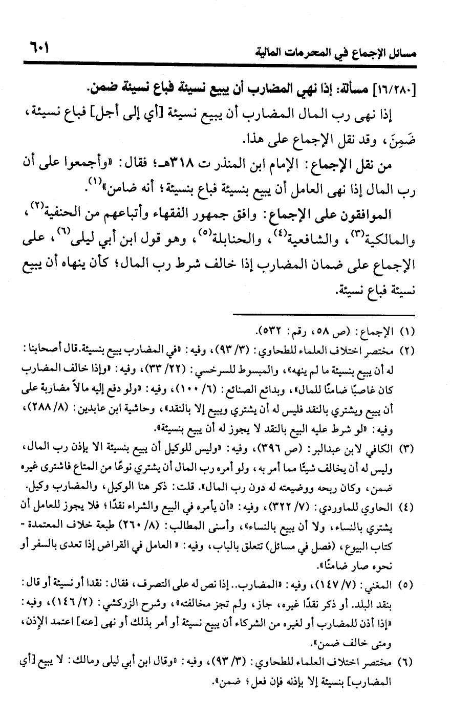 • من نقل الإجماع: الإمام ابن المنذر ت 318 هـ؛ فقال: "وأجمعوا على أن رب المال إذا نهى العامل أن يبيع بنسيئة فباع بنسيئة؛ أنه ضامن" (¬1).