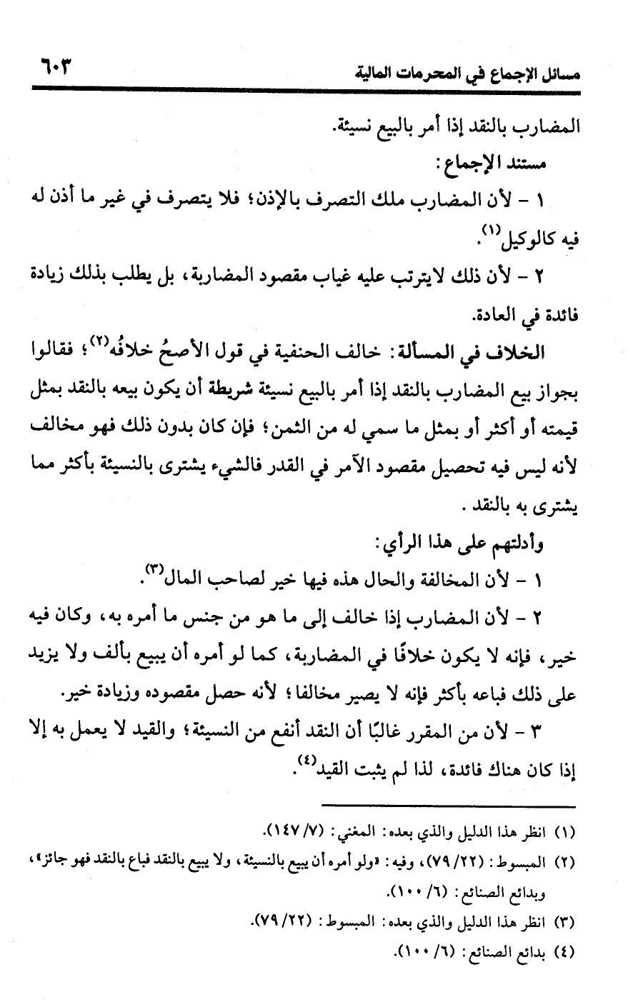 • الخلاف في المسألة: خالف الحنفية في قول الأصحُّ خلافُه (¬2)؛ فقالوا بجواز بيع المضارب بالنقد إذا أمر بالبيع نسيئة شريطة أن يكون بيعه بالنقد بمثل قيمته أو أكثر أو بمثل ما سمي له من الثمن؛ فإن كان بدون ذلك فهو مخالف لأنه ليس فيه تحميل مقصود الآمر في القدر فالشيء يشترى بالنسيئة بأكثر مما يشترى به بالنقد.