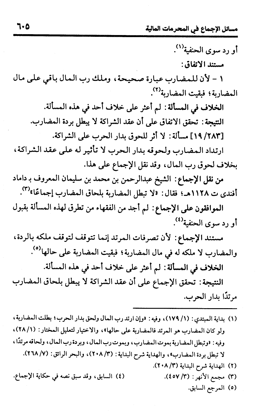 • من نقل الإجماع: الشيخ عبد الرحمن بن محمد بن سليمان المعروف بـ داماد أفندى ت 1128 هـ؛ فقال: "لا تبطل المضاربة بلحاق المضارب إجماعًا" (¬3).