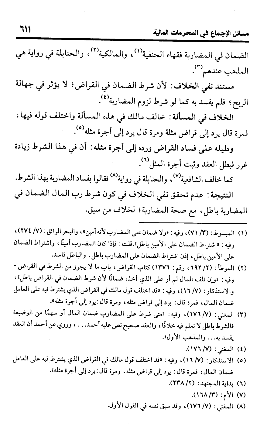 كما خالف الشافعية (¬7)، والحنابلة في رواية (¬8) فقالوا بفساد المضاربة بهذا الشرط.Rعدم تحقق نفي الخلاف في كون شرط رب المال الضمان في المضاربة باطل، مع صحة المضاربة؛ لخلاف من سبق.