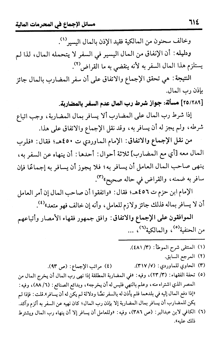 • ودليله: أن الإنفاق من المال اليسير في السفر لا يتحمله المال، لذا لم يستلزم هذا المال السفر به لأنه ينقضي به ما القراض (¬2).Rهي تحقق الإجماع والاتفاق على أن سفر المضارب بالمال جائز بإذن رب المال.