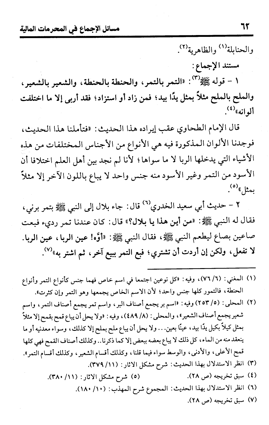 1 - قوله -صلى اللَّه عليه وسلم- (¬3): "التمر بالتمر، والحنطة بالحنطة، والشعير بالشعير، والملح بالملح مثلًا بمثل يدًا بيد؛ فمن زاد أو استزاد؛ فقد أربى إلا ما اختلفت ألوانه" (¬4).