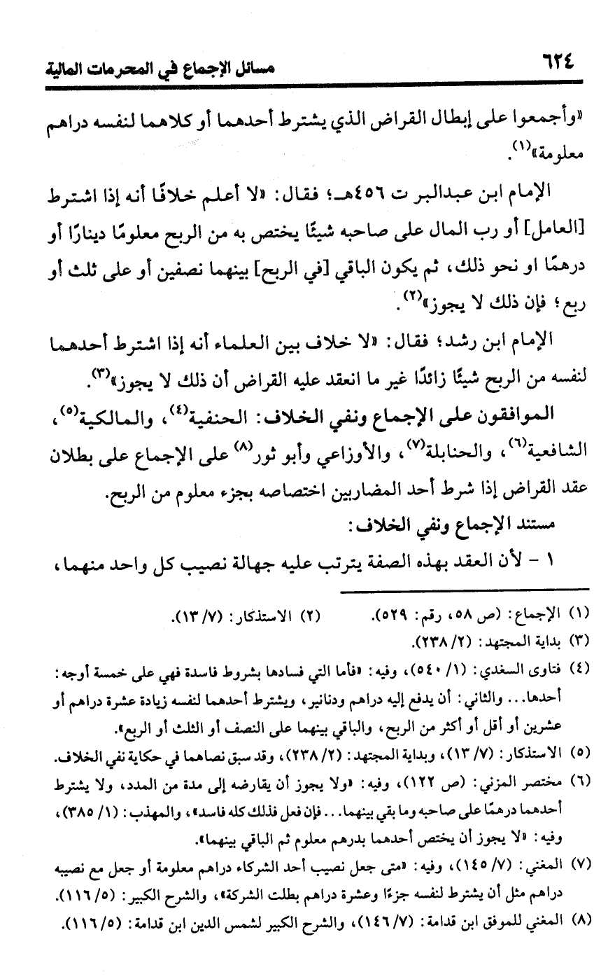 الإمام ابن عبد البر ت 456 هـ؛ فقال: "لا أعلم خلافًا أنه إذا اشترط [العامل] أو رب المال على صاحبه شيئًا يختص به من الربح معلومًا دينارًا أو درهمًا أو نحو ذلك، ثم يكون الباقي [في الربح] بينهما نصفين أو على ثلث أو ربع؛ فإن ذلك لا يجوز" (¬2).