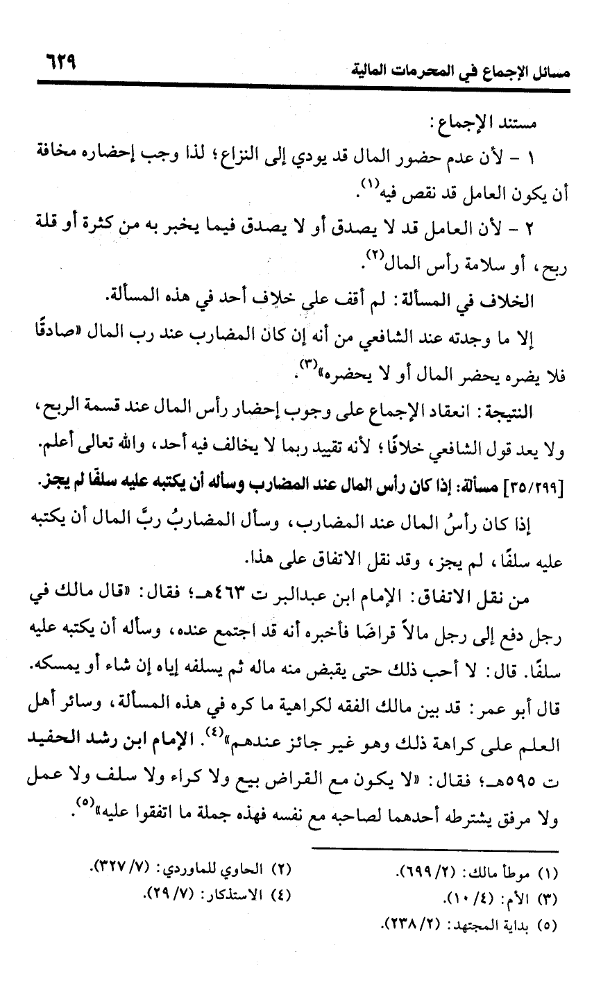 • من نقل الاتفاق: الإمام ابن عبد البر ت 463 هـ؛ فقال: "قال مالك في رجل دفع إلى رجل مالًا قراضًا فأخبره أنه قد اجتمع عنده، وسأله أن يكتبه عليه سلفًا. قال: لا أحب ذلك حتى يقبض منه ماله ثم يسلفه إياه إن شاء أو يمسكه. قال أبو عمر: قد بين مالك الفقه لكراهية ما كره في هذه المسألة، وسائر أهل العلم على كراهة ذلك وهو غير جائز عندهم" (¬4). الإمام ابن رشد الحفيد ت 595 هـ؛ فقال: "لا يكون مع القراض بيع ولا كراء ولا سلف ولا عمل ولا مرفق يشترطه أحدهما لصاحبه مع نفسه فهذه جملة ما اتفقوا عليه" (¬5).