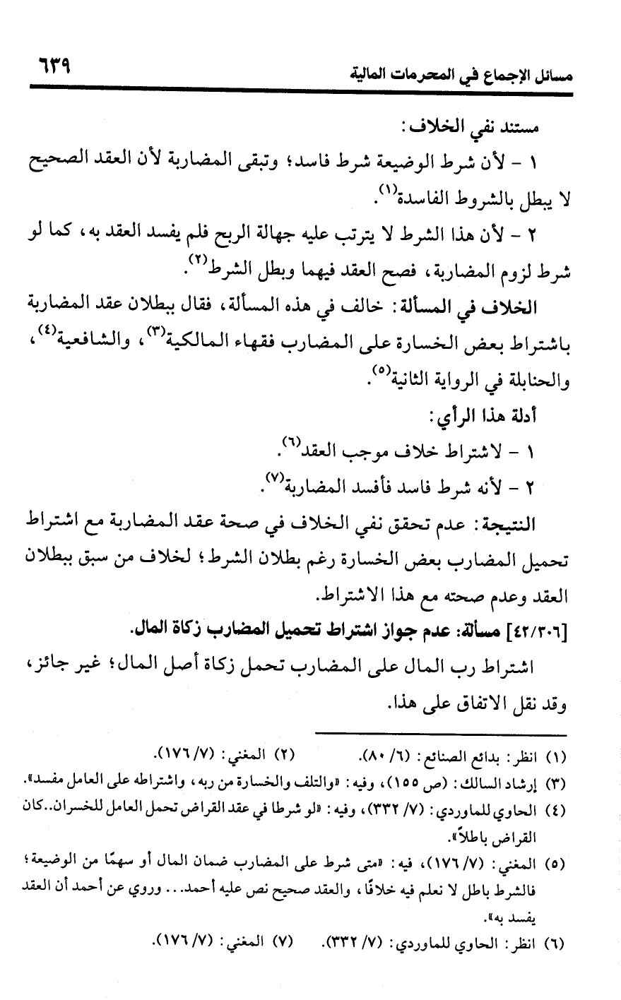 2 - لأنه شرط فاسد فأفسد المضاربة (¬7).Rعدم تحقق نفي الخلاف في صحة عقد المضاربة مع اشتراط تحميل المضارب بعض الخسارة رغم بطلان الشرط؛ لخلاف من سبق ببطلان العقد وعدم صحته مع هذا الاشتراط.