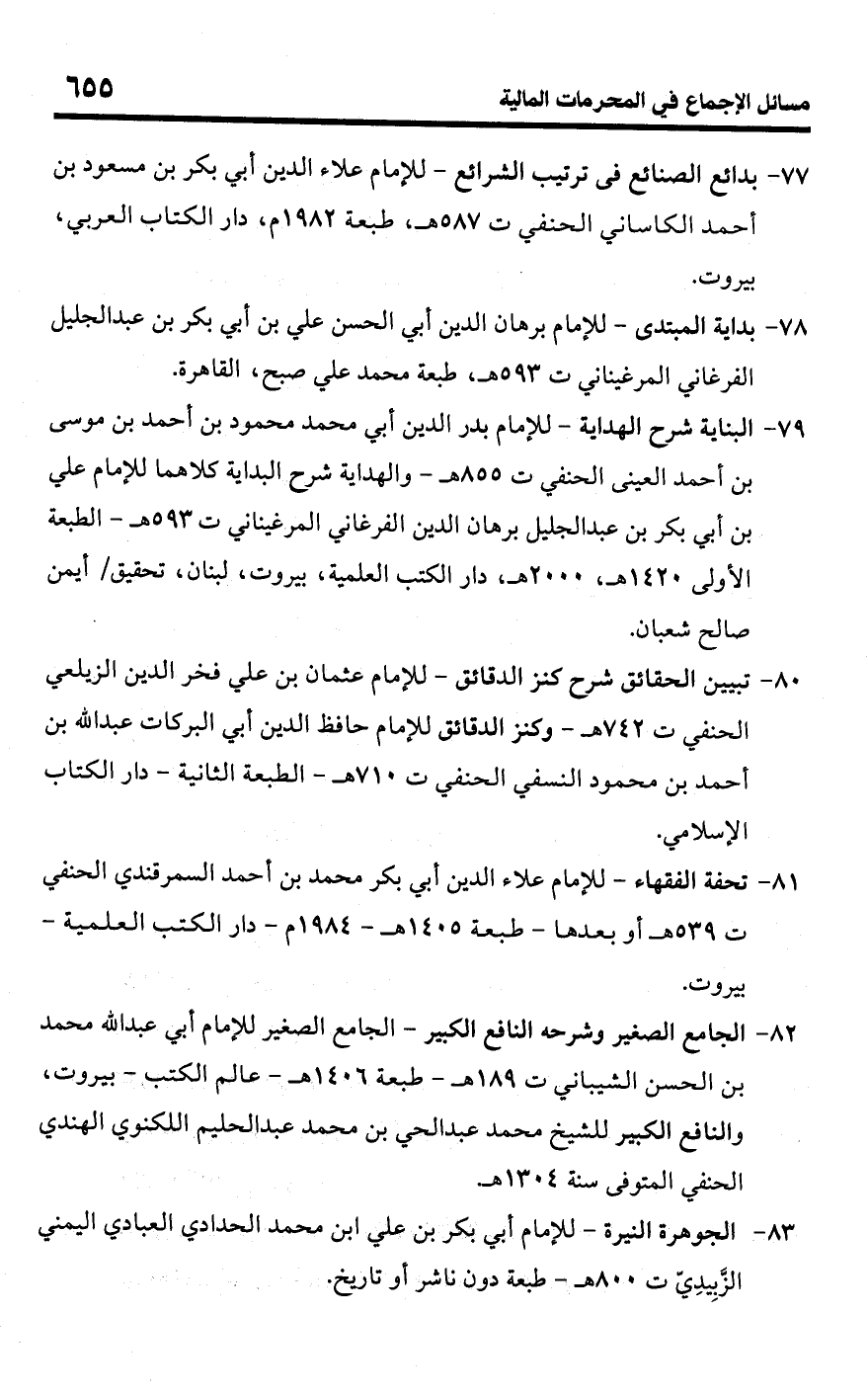 77 - بدائع الصنائع في ترتيب الشرائع - للإمام علاء الدين أبي بكر بن مسعود بن أحمد الكاساني الحنفي ت 587 هـ، طبعة 1982 م، دار الكتاب العربي، بيروت.
