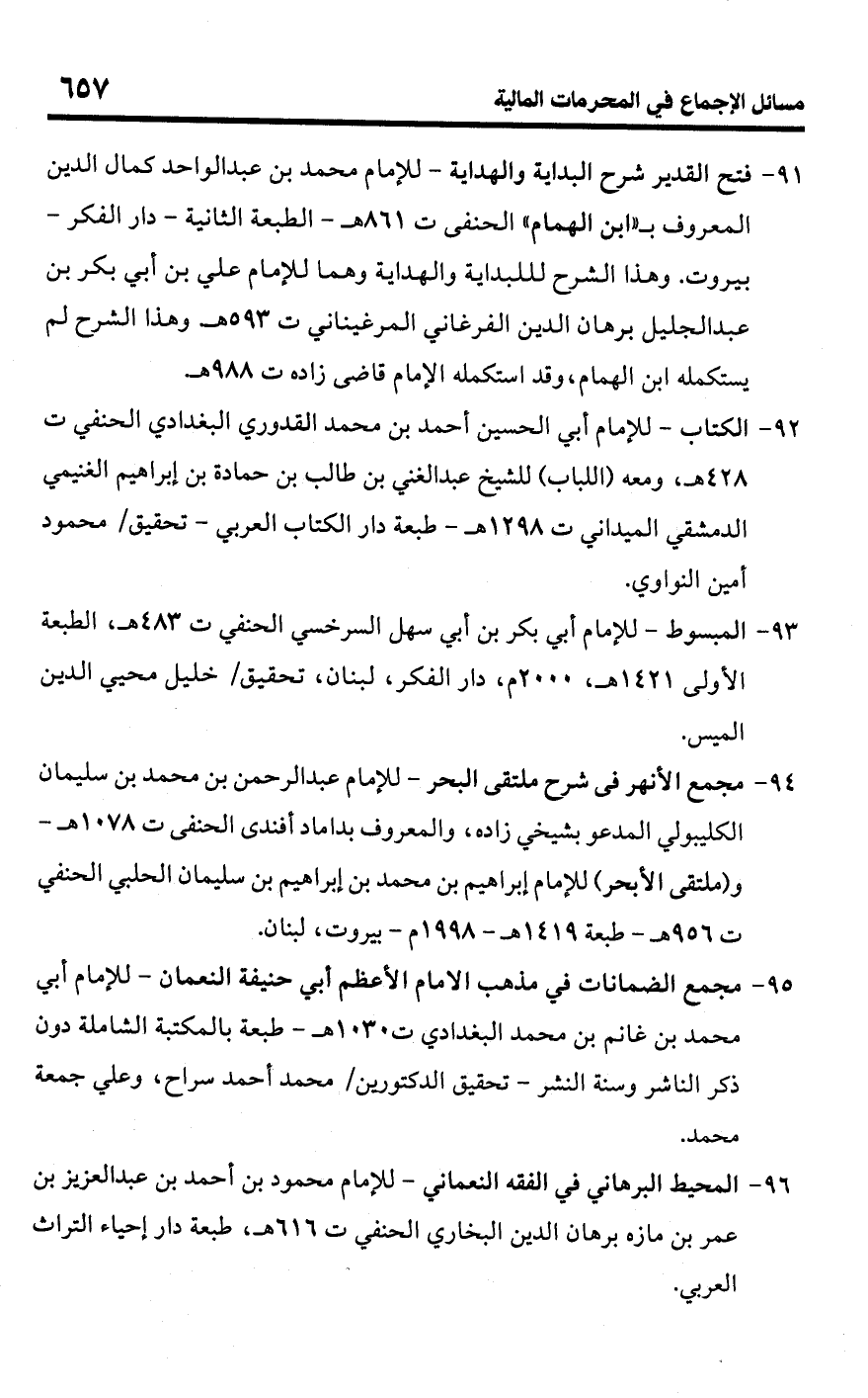 91 - فتح القدير شرح البداية والهداية - للإمام محمد بن عبد الواحد كمال الدين المعروف بـ "ابن الهمام" الحنفى ت 861 هـ - الطبعة الثانية - دار الفكر - بيروت. وهذا الشرح للبداية والهداية وهما للإمام علي بن أبي بكر بن عبد الجليل برهان الدين الفرغاني المرغيناني ت 593 هـ وهذا الشرح لم يستكمله ابن الهمام، وقد استكمله الإمام قاضى زاده ت 988 هـ.