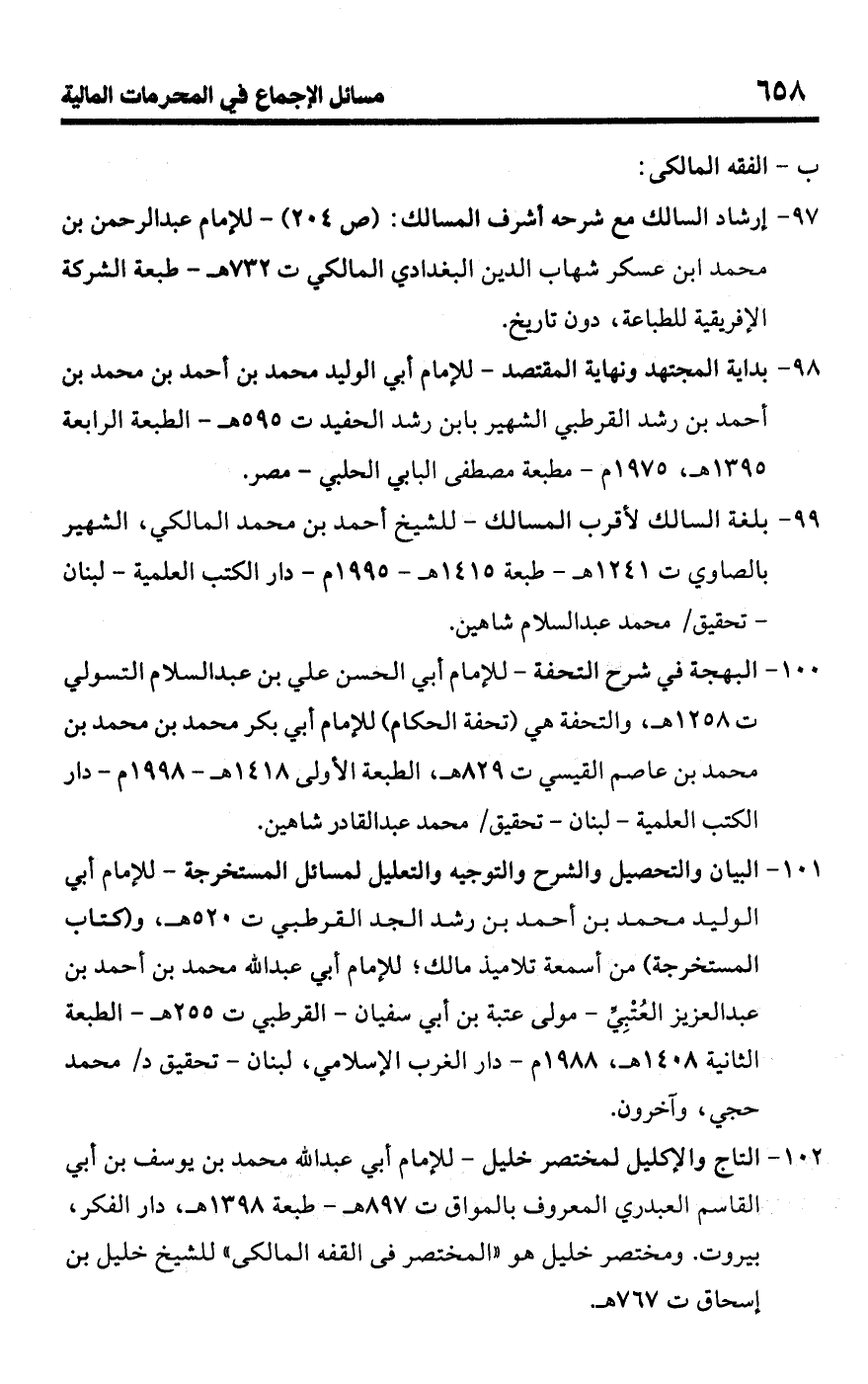 101 - البيان والتحصيل والشرح والتوجيه والتعليل لمسائل المستخرجة - للإمام أبي الوليد محمد بن أحمد بن رشد الجد القرطبي ت 520 هـ، وكتاب المستخرجة) من أسمعة تلاميذ مالك؛ للإمام أبي عبد اللَّه محمد بن أحمد بن عبد العزيز العُتْبِيِّ - مولى عتبة بن أبي سفيان - القرطبي ت 255 هـ - الطبعة الثانية 1408 هـ، 1988 م - دار الغرب الإسلامي، لبنان - تحقيق د/ محمد حجي، وآخرون.