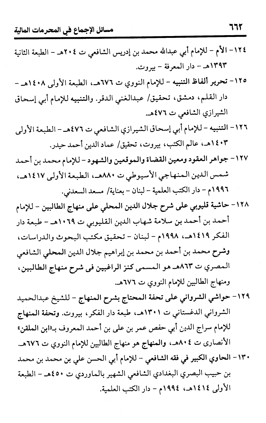 129 - حواشي الشرواني على تحفة المحتاج بشرح المنهاج - للشيخ عبد الحميد الشرواني الدغستاني ت 1301 هـ، طبعة دار الفكر، بيروت. وتحفة المنهاج للإمام سراج الدين أبي حفص عمر بن علي بن أحمد المعروف بـ "ابن الملقن" الأنصاري ت 804 هـ، والمنهاج هو منهاج الطالبين للإمام النووي ت 676 هـ.