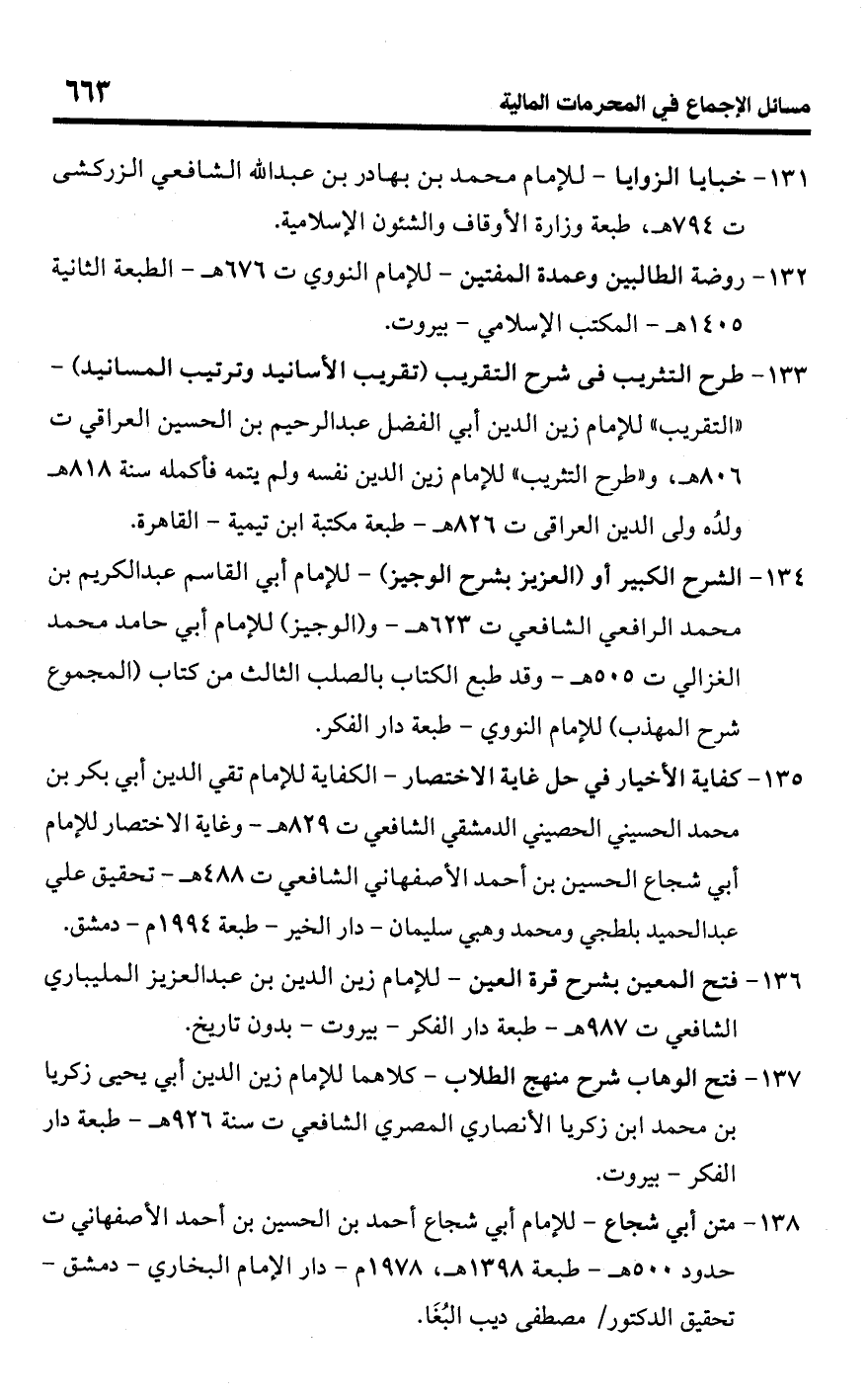 133 - طرح التثريب في شرح التقريب (تقريب الأسانيد وترتيب المسانيد) - "التقريب" للإمام زين الدين أبي الفضل عبد الرحيم بن الحسين العراقي ت 806 هـ، و"طرح التثريب" للإمام زين الدين نفسه ولم يتمه فأكمله سنة 818 هـ ولدُه ولى الدين العراقى ت 826 هـ - طبعة مكتبة ابن تيمية - القاهرة.