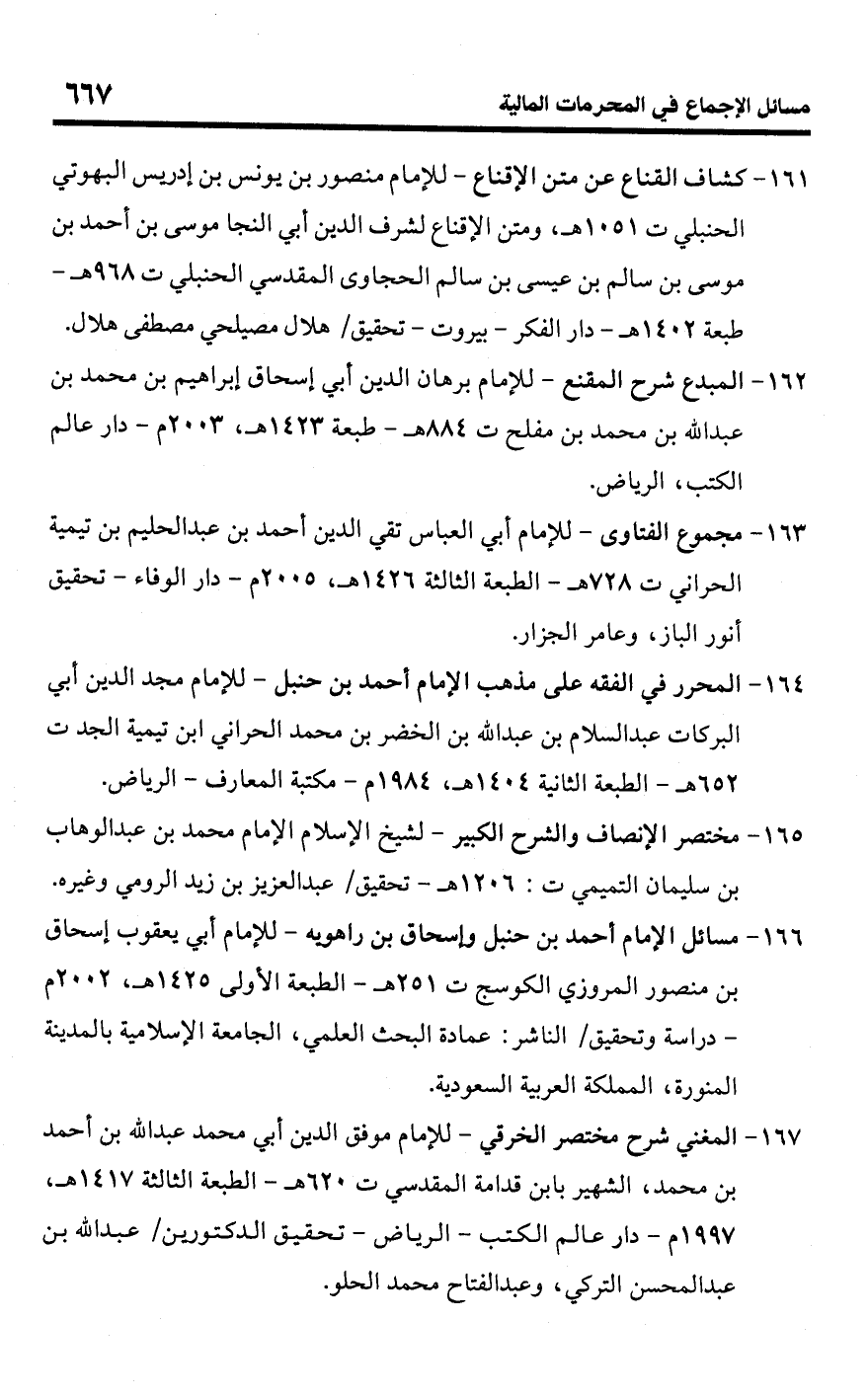162 - المبدع شرح المقنع - للإمام برهان الدين أبي إسحاق إبراهيم بن محمد بن عبد اللَّه بن محمد بن مفلح ت 884 هـ - طبعة 1423 هـ، 2003 م - دار عالم الكتب، الرياض.
