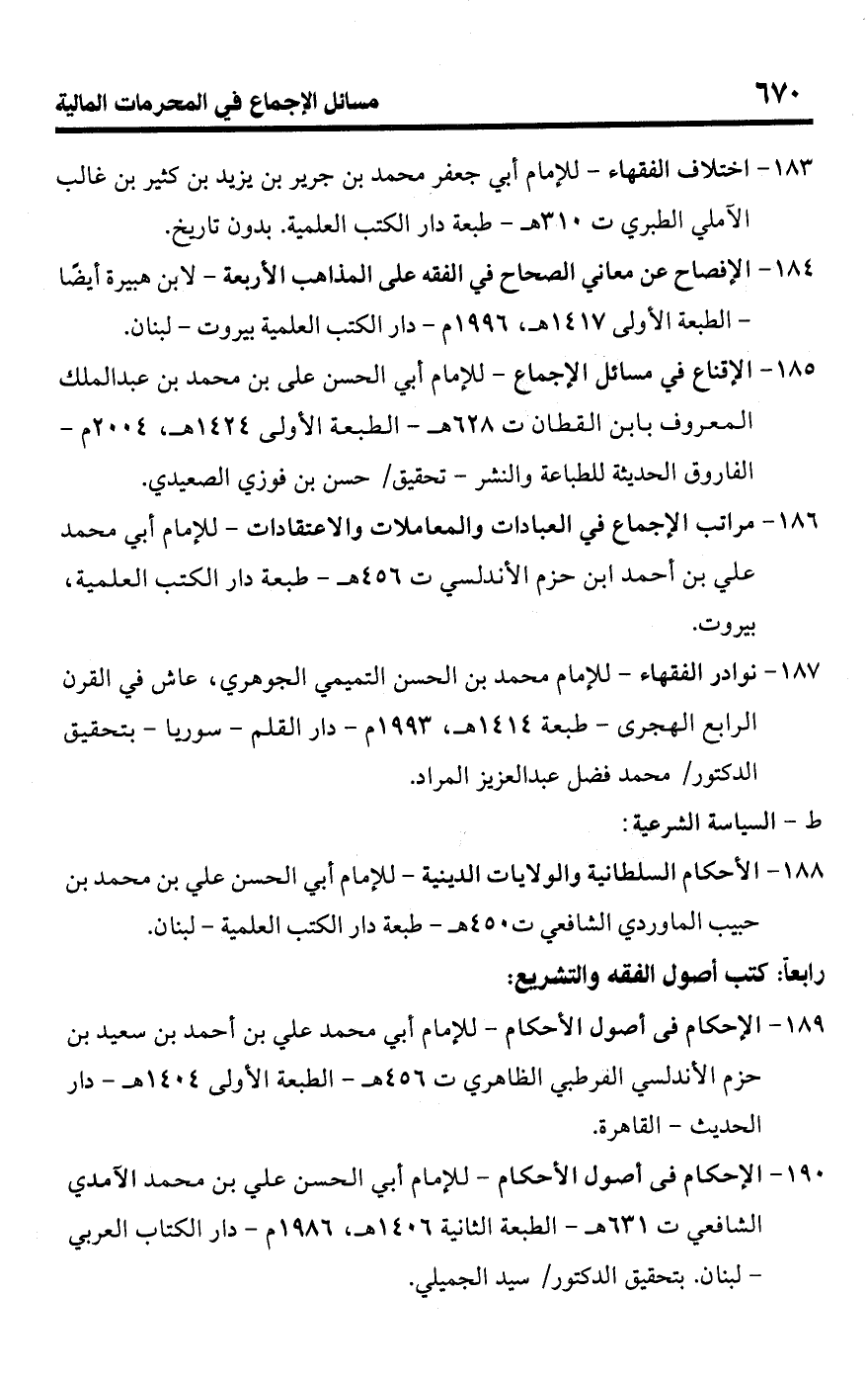 186 - مراتب الإجماع في العبادات والمعاملات والاعتقادات - للإمام أبي محمد علي بن أحمد ابن حزم الأندلسي ت 456 هـ - طبعة دار الكتب العلمية، بيروت.
