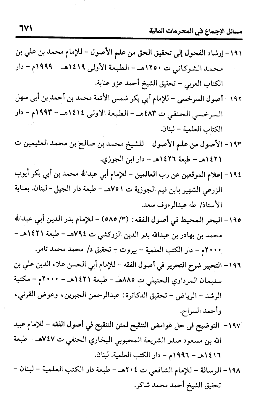191 - إرشاد الفحول إلى تحقيق الحق من علم الأصول- للإمام محمد بن علي بن محمد الشوكاني ت 1250 هـ - الطبعة الأولى 1419 هـ -1999 م - دار الكتاب العربي - تحقيق الشيخ أحمد عزو عناية.