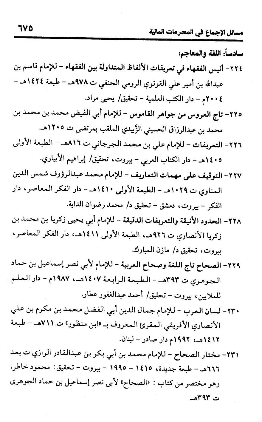 231 - مختار الصحاح - للإمام محمد بن أبي بكر بن عبد القادر الرازي ت بعد 666 هـ - طبعة جديدة، 1415 - 1995 - بيروت - تحقيق: محمود خاطر. وهو مختصر من كتاب: "الصحاح" لأبي نصر إسماعيل بن حماد الجوهرى ت 393 هـ