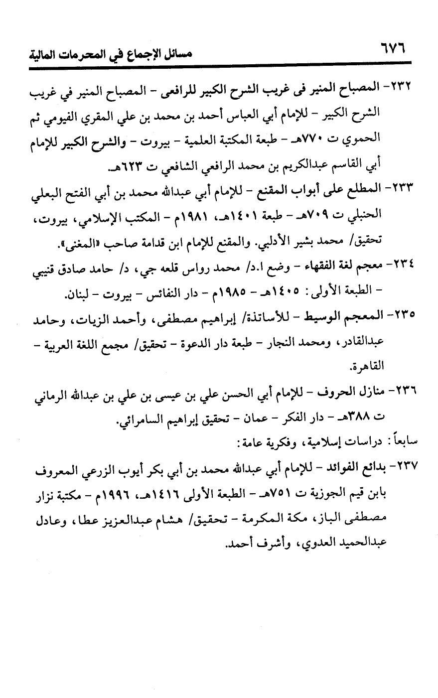 233 - المطلع على أبواب المقنع - للإمام أبي عبد اللَّه محمد بن أبي الفتح البعلي الحنبلي ت 709 هـ - طبعة 1401 هـ، 1981 م - المكتب الإسلامي، بيروت، تحقيق/ محمد بشير الأدلبي. والمقنع للإمام ابن قدامة صاحب "المغنى".