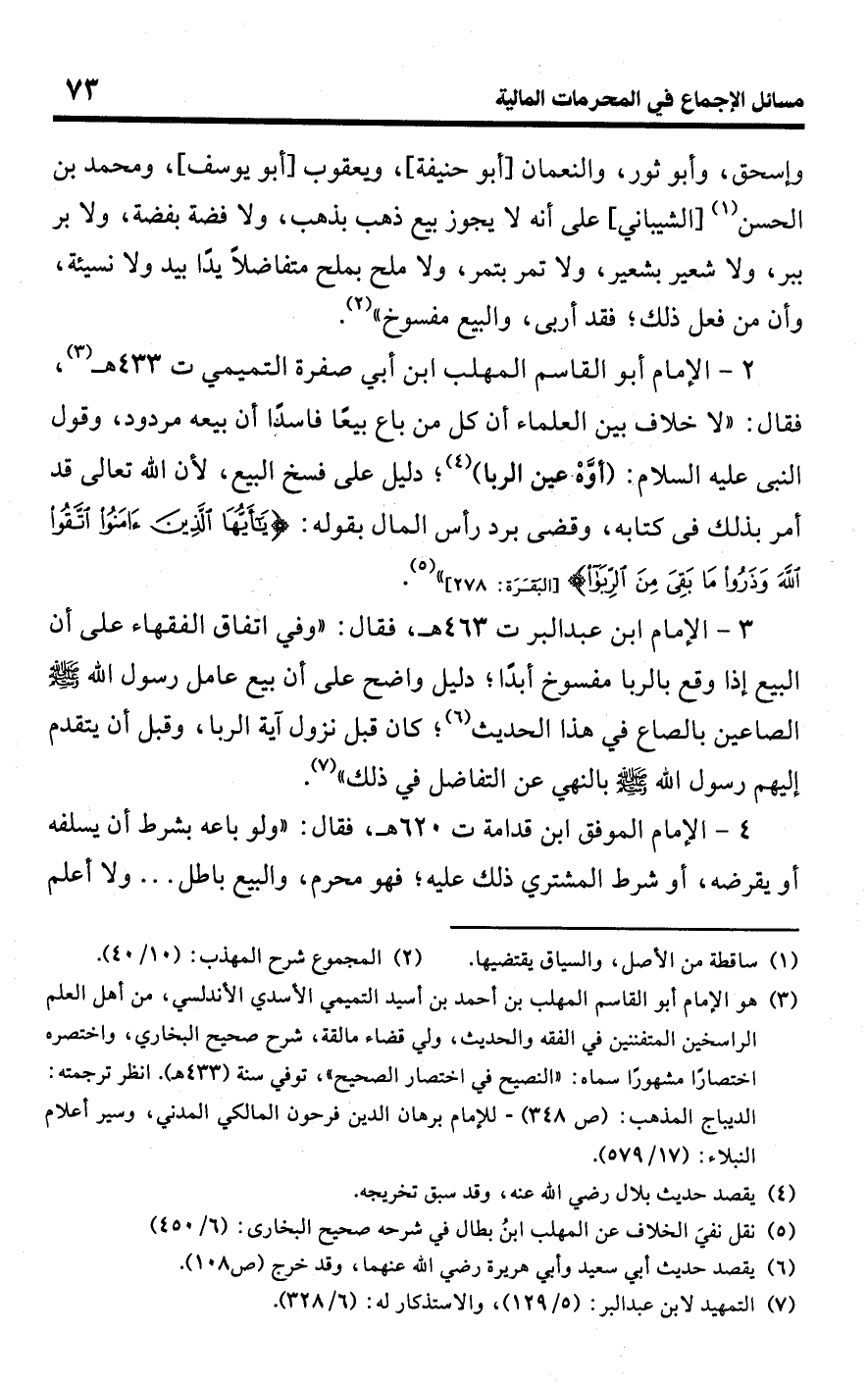 3 - الإمام ابن عبد البر ت 463 هـ، فقال: "وفي اتفاق الفقهاء على أن البيع إذا وقع بالربا مفسوخ أبدًا؛ دليل واضح على أن بيع عامل رسول اللَّه -صلى اللَّه عليه وسلم- الصاعين بالصاع في هذا الحديث (¬6)؛ كان قبل نزول آية الربا، وقبل أن يتقدم إليهم رسول اللَّه -صلى اللَّه عليه وسلم- بالنهي عن التفاضل في ذلك" (¬7).
