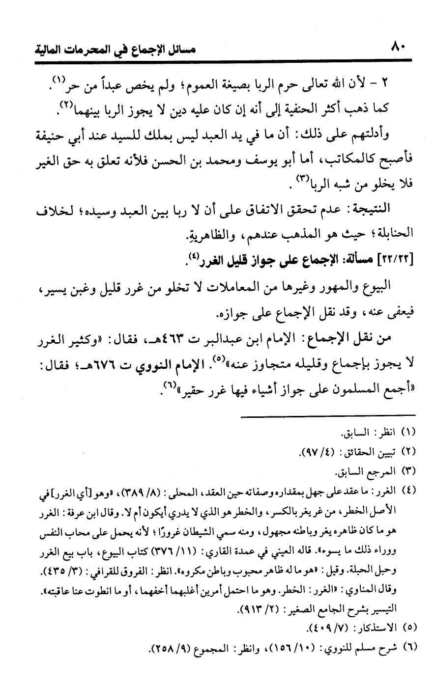 • من نقل الإجماع: الإمام ابن عبد البر ت 463 هـ، فقال: "وكثير الغرر لا يجوز بإجماع وقليله متجاوز عنه" (¬5). الإمام النووي ت 676 هـ؛ فقال: "أجمع المسلمون على جواز أشياء فيها غرر حقير" (¬6).