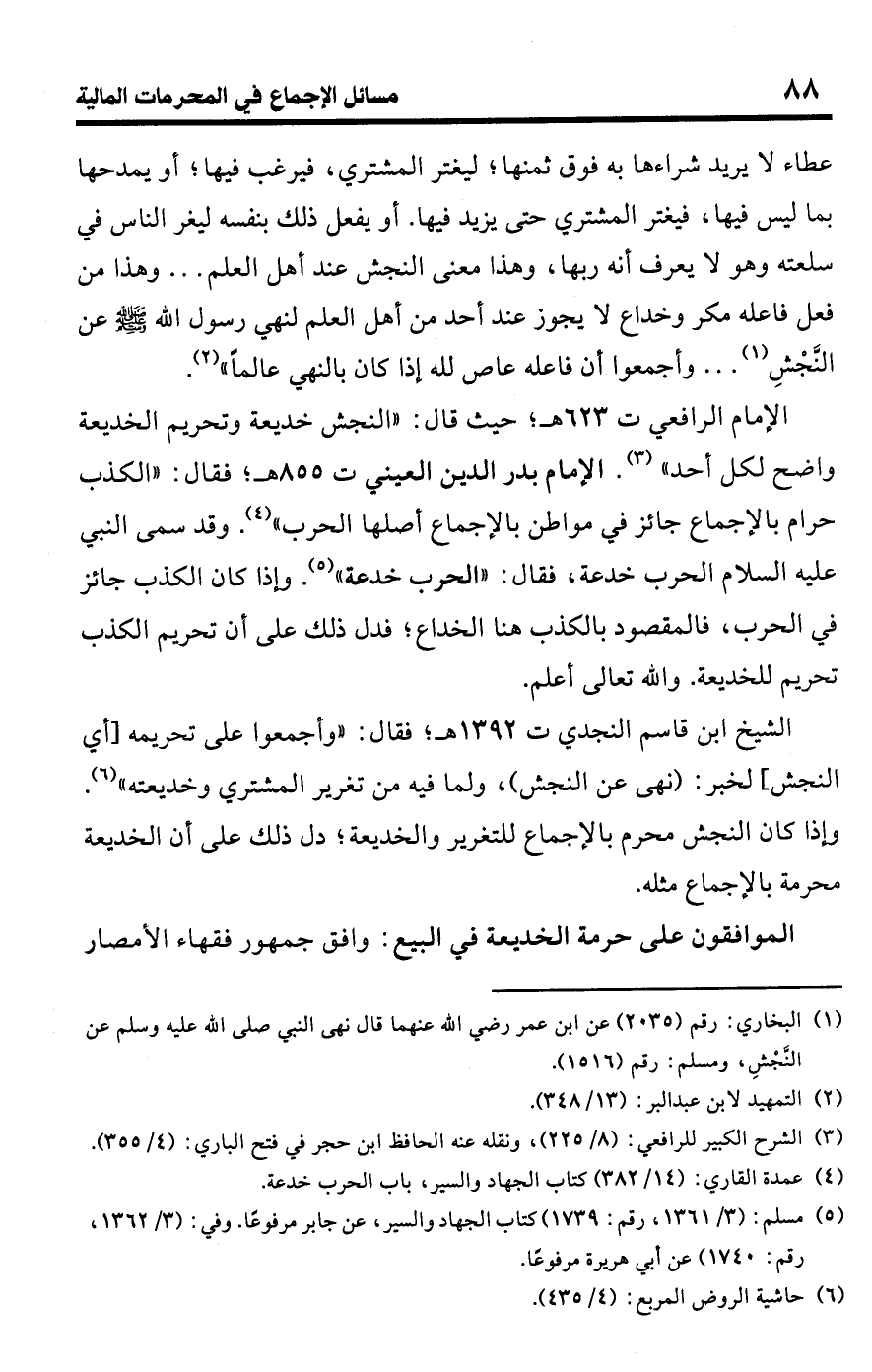 الشيخ ابن قاسم النجدي ت 1392 هـ؛ فقال: "وأجمعوا على تحريمه [أي النجش] لخبر: (هى عن النجش)، ولما فيه من تغرير المشتري وخديعته" (¬6). وإذا كان النجش محرم بالإجماع للتغرير والخديعة؛ دل ذلك على أن الخديعة محرمة بالإجماع مثله.