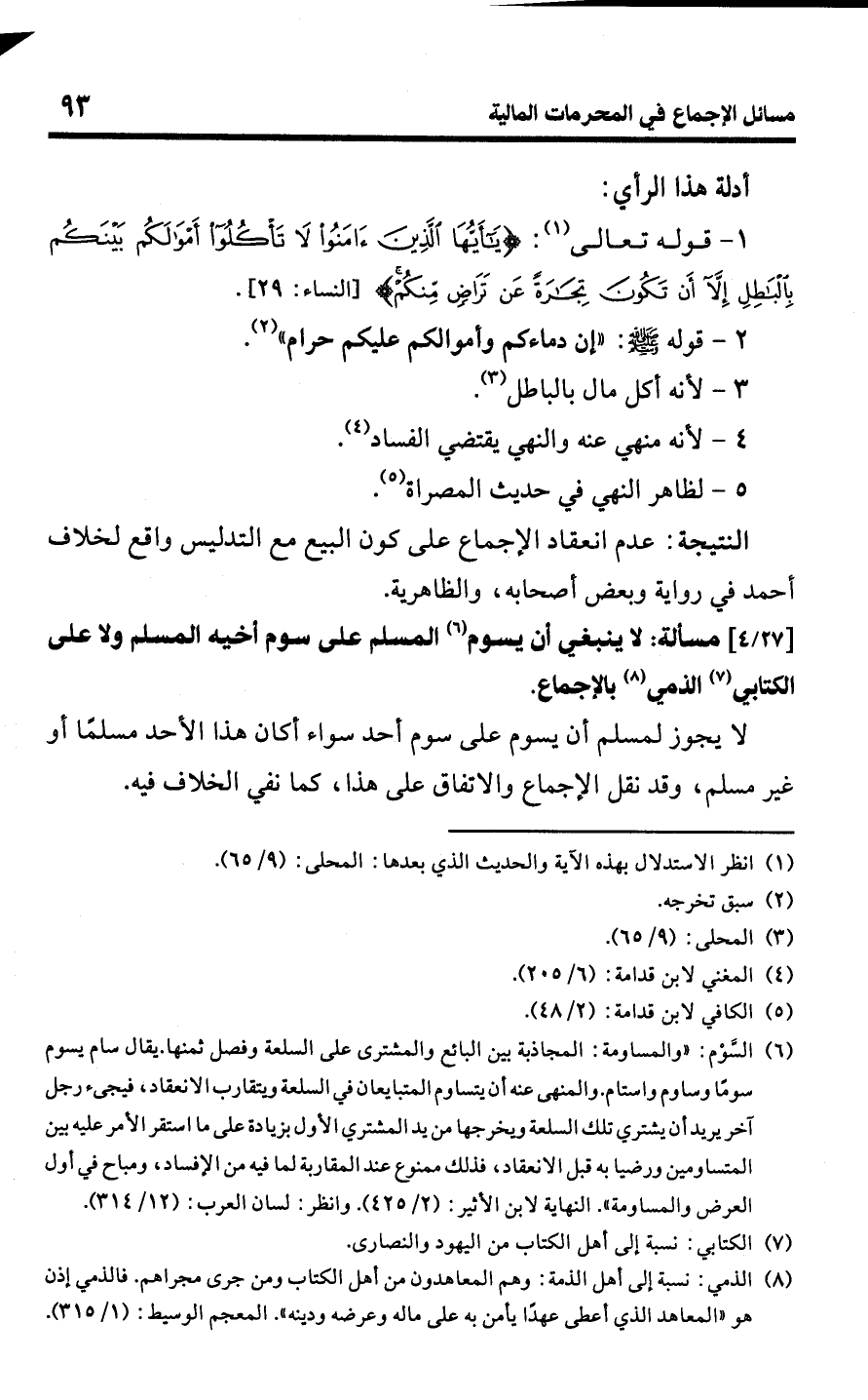 [27/ 4] مسألة: لا ينبغي أن يسوم (¬6) المسلم على سوم أخيه المسلم ولا على الكتابي (¬7) الذمي (¬8) بالإجماع.