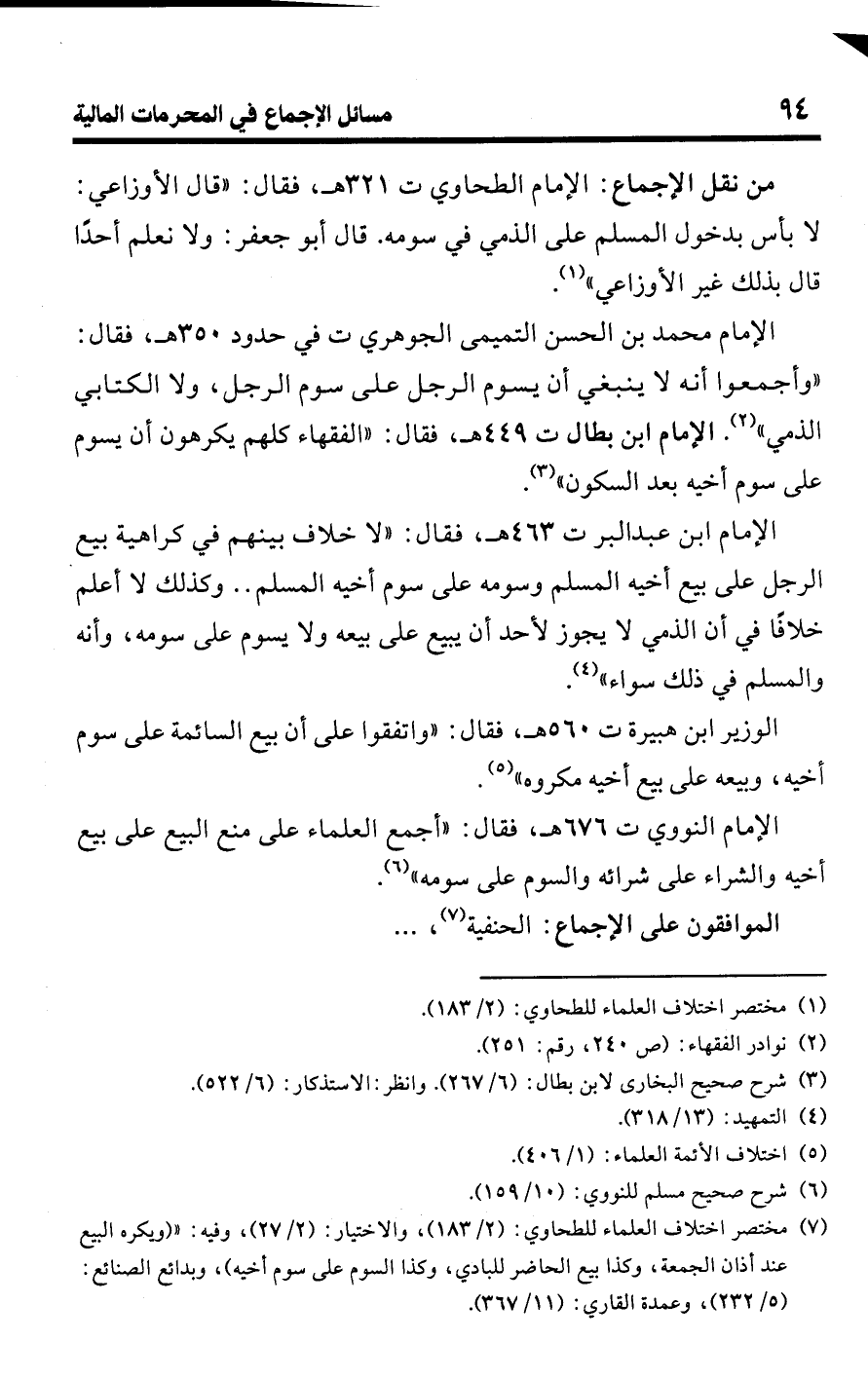 الإمام محمد بن الحسن التميمي الجوهري ت في حدود 350 هـ، فقال: "وأجمعوا أنه لا ينبغي أن يسوم الرجل على سوم الرجل، ولا الكتابي الذمي" (¬2). الإمام ابن بطال ت 449 هـ، فقال: "الفقهاء كلهم يكرهون أن يسوم على سوم أخيه بعد السكون" (¬3).