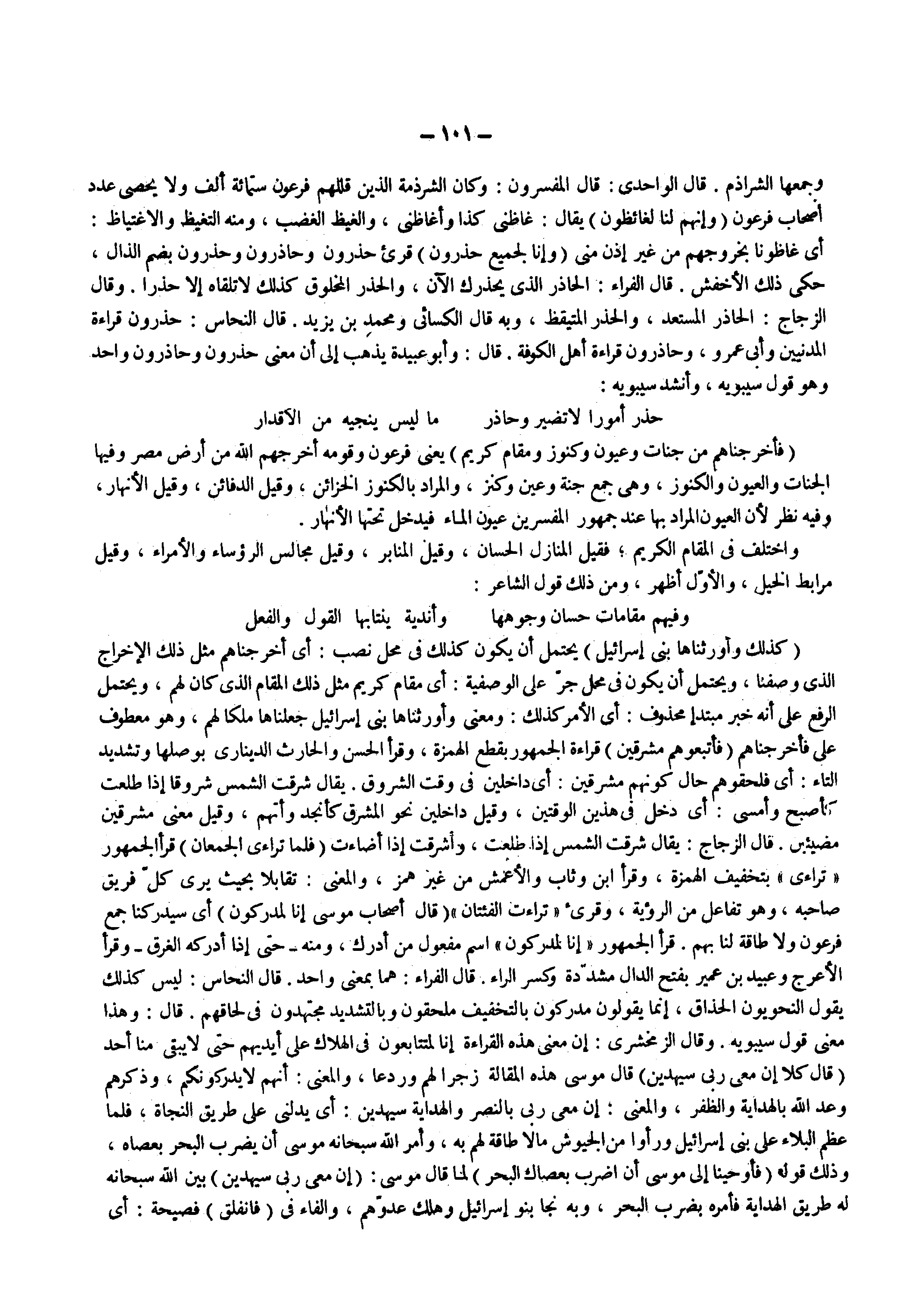 ) وإنا لجميع حاذرون ( قرئ حذرون وحاذرون وحذرون بضم الذال حكى ذلك الأخفش قال الفراء الحاذر الذى يحذرك الآن والحذر المخلوق كذلك لا تلقاه إلا حذرا وقال الزجاج الحاذر المستعد والحذر المتيقظ وبه قال الكسائى ومحمد بن يزيد قال النحاس حذرون قراءة المدنيين وأبى عمرو وحاذرون قراءة أهل الكوفة قال وأبو عبيدة يذهب إلى أن معنى حذرون وحاذرون واحد وهو قول سيبويه وأنشد سيبويه حذر أمورا لاتضير وحاذر