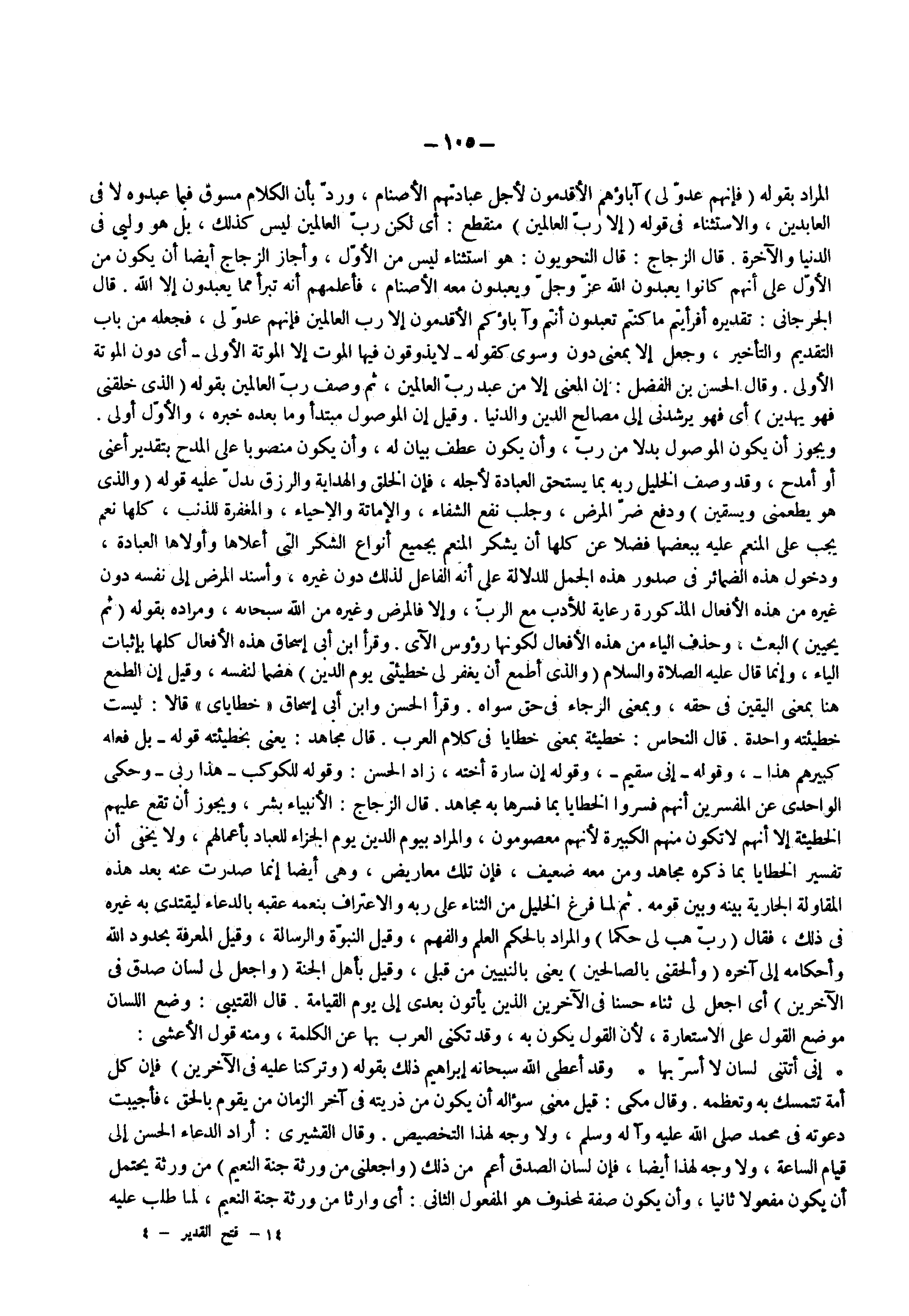 المراد بقوله ) فإنهم عدو لي ( آباؤهم الأقدمون لأجل عبادتهم الأصنام ورد بأن الكلام مسوق فيما عبدوه لا فى العابدين والاستثناء فى قوله ) إلا رب العالمين ( منقطع أى لكن رب العالمين ليس كذلك بل هو ولي في الدنيا والآخرة قال الزجاج قال النحويون هو استثناء ليس من الأول وأجاز الزجاج أيضا أن يكون من الأول على أنهم كانوا يعبدون الله عز وجل ويعبدون معه الأصنام فأعلمهم أنه تبرأ مما يعبدون إلا الله قال الجرجاني تقديره أفرأيتم ما كنتم تعبدون أنتم وآباؤكم الأقدمون إلا رب العالمين فإنهم عدو لى فجعله من باب التقديم والتأخير وجعل إلا بمعنى دون وسوى كقوله لايذقون فيها الموت إلا الموتة الأولى أي دون الموتة الأولى وقال الحسن بن الفضل إن المعنى إلا من عبد رب العالمين