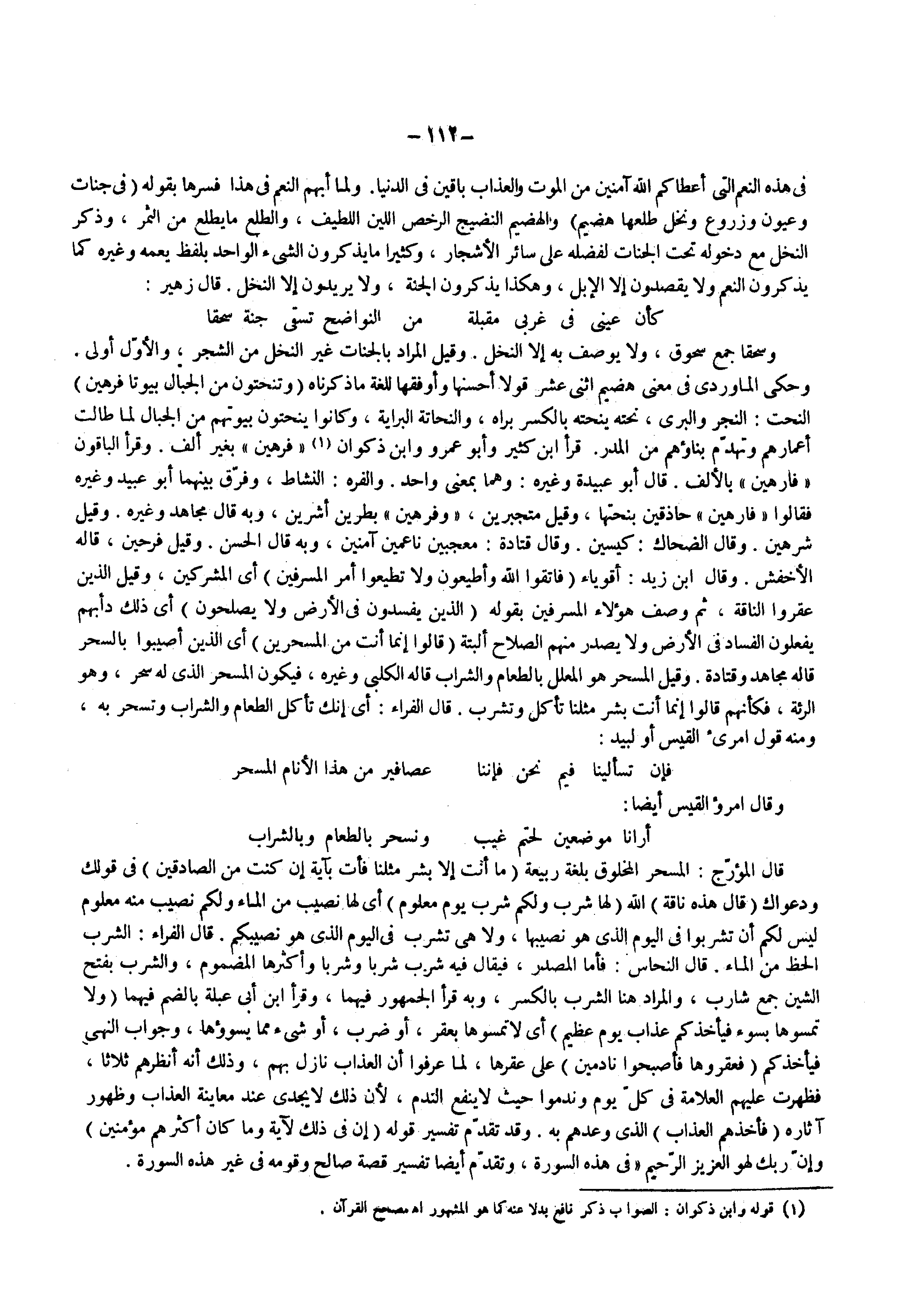 ولما أبهم النعم فى هذا فسرها بقوله ) في جنات وعيون وزروع ونخل طلعها هضيم ( والهضيم النضيج الرخص اللين اللطيف والطلع مايطلع من الثمر وذكر النخل مع دخوله تحت الجنات لفضله على سائر الأشجار وكثيرا مايذكرون الشىء الواحد بلفظ يعمه وغيره كما يذكرون النعم ولايقصدون إلا الإبل وهكذا يذكرون الجنة ولايريدون إلا النخل قال زهير كأن عينى فى غربى مقبلة