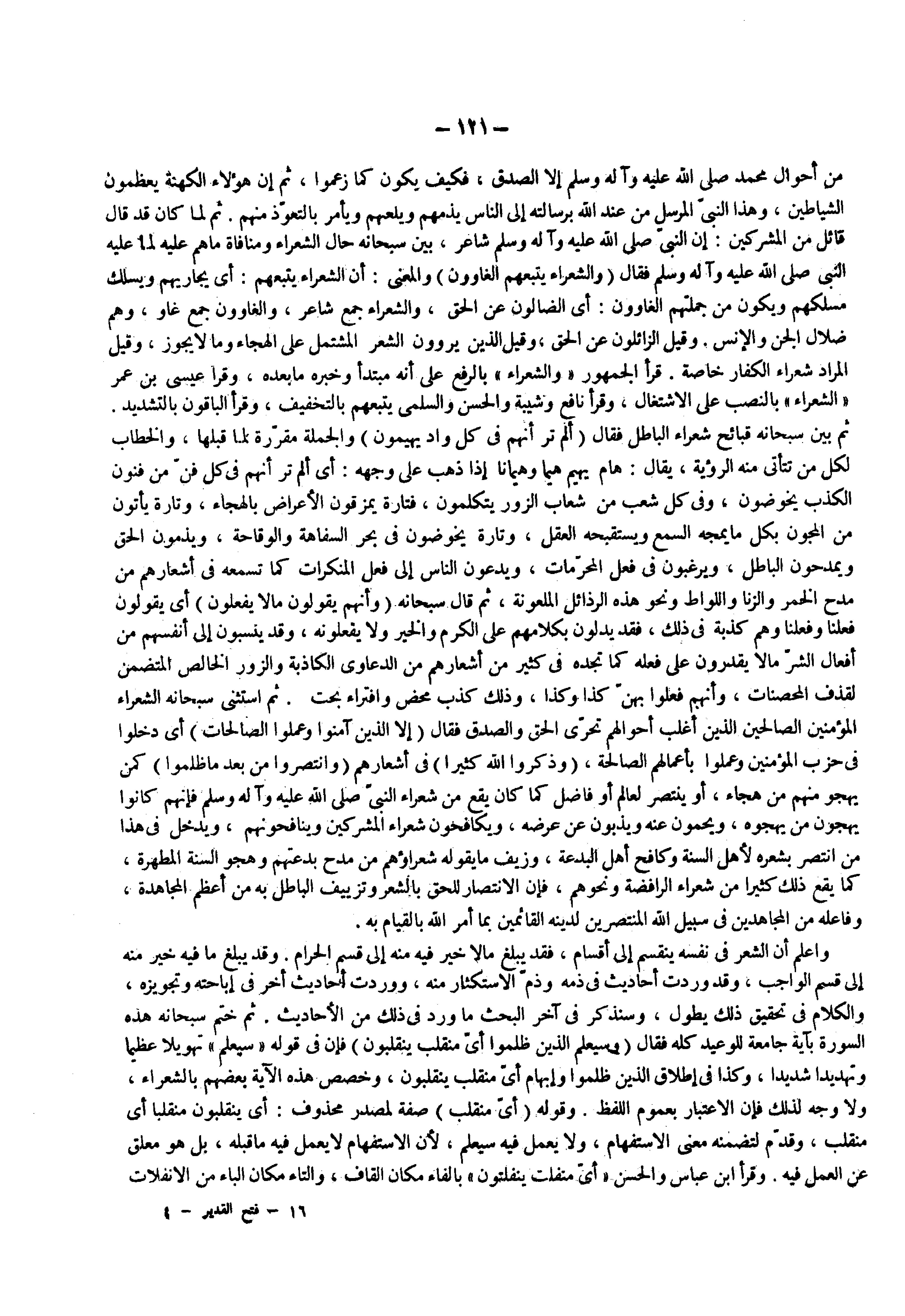 ثم استثنى سبحانه الشعراء المؤمنين الصالحين الذين أغلب أحوالهم تحرى والصدق فقال ) إلا الذين آمنوا وعملوا الصالحات ( أى دخلوا فى حزب المؤمنين وعملوا بأعمالهم الصالحة ) وذكروا الله كثيرا ( فى أشعارهم ) وانتصروا من بعد ما ظلموا ( كمن يهجو منهم من هجاء أو ينتصر لعالم أو فاضل كما كان يقع من شعراء النبى ( صلى الله عليه وسلم ) فإنهم كانوا يهجون من يهجوه ويحمون عنه ويذبون عن عرضه ويكافحون شعراء المشركين وينافحونهم ويدخل فى هذا من انتصر بشعره لأهل السنة وكافح أهل البدعة وزيف مايقوله شعراؤهم من مدح بدعتهم وهجو السنة المطهرة كما يقع ذلك كثيرا من شعراء الرافضة ونحوهم فإن الانتصار للحق وتزييف الباطل به من أعظم المجاهدة وفاعلة من المجاهدين فى سبيل الله المنتصرين لدينه القائمين بما أمر الله بالقيام به