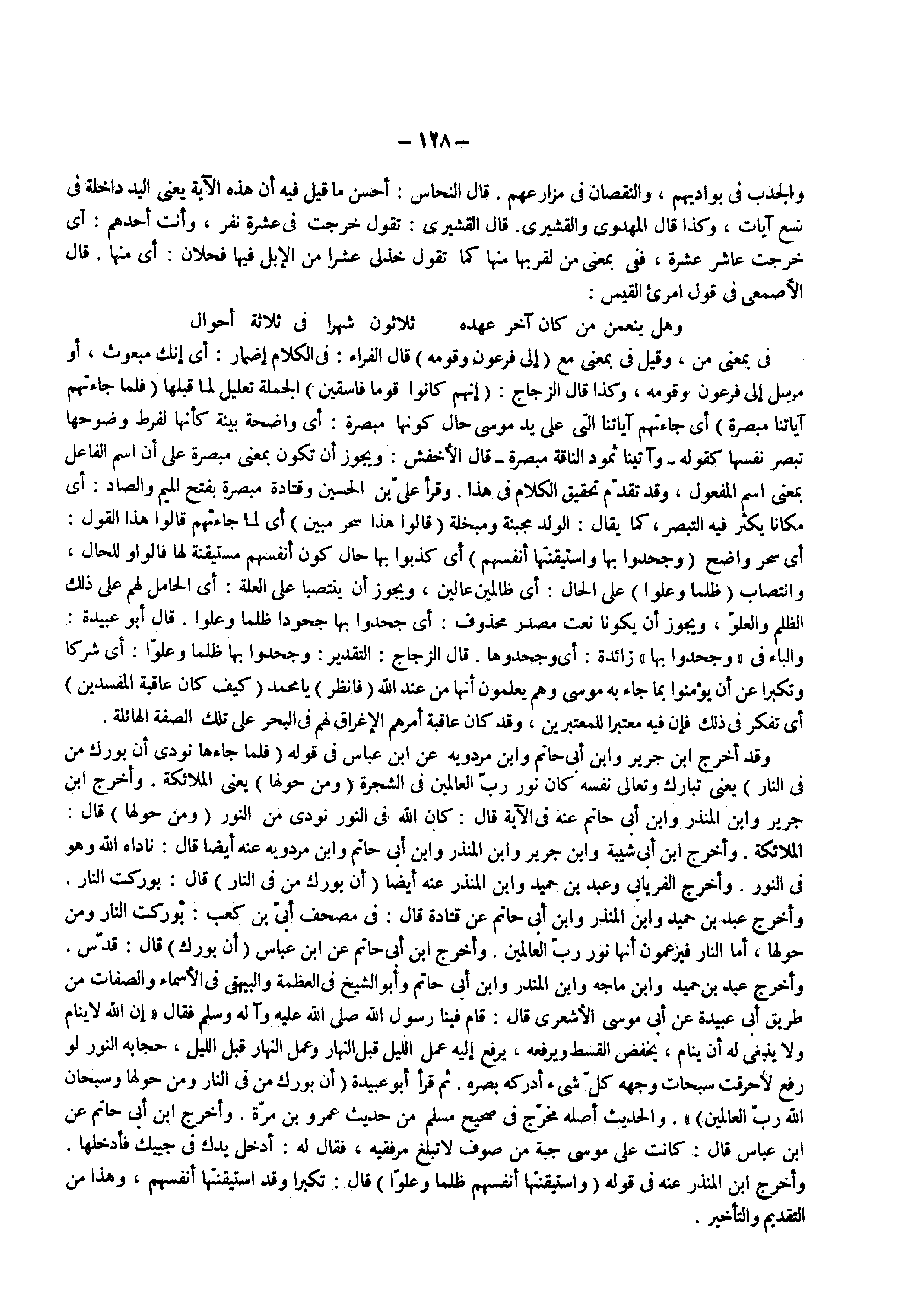 وقد أخرج ابن جرير وابن أبى حاتم وابن مردويه عن ابن عباس فى قوله ) فلما جاءها نودي أن بورك من في النار ( يعنى تبارك وتعالى نفسه كان نور رب العالمين فى الشجرة ) ومن حولها ( يعنى الملائكة وأخرج ابن جرير وابن المنذر وابن أبى حاتم عنه فى الآية قال كان الله فى النور نودى من النور ) ومن حولها ( قال الملائكة وأخرج ابن أبى شيبة وابن جرير وابن المنذر وابن أبى حاتم وابن مردويه عنه أيضا قال ناداه الله وهو فى النور وأخرج الفريابى وعبد بن حميد وابن المنذر عنه أيضا ) أن بورك من في النار ( قال بوركت النار وأخرج عبد بن حميد وابن المنذر وابن أبي حاتم عن قتادة قال فى مصحف أبى بن كعب بوركت النار ومن حولها أما النار فيزعمون أنها نور رب العالمين وأخرج ابن أبي حاتم وابن عباس ) أن بورك ( قال قدس وأخرج عبد بن حميد وابن ماجه وابن المنذر وابن أبى حاتم وأبو الشيخ فى العظمة والبيهقى فى الأسماء والصفات من طريق أبى عبيدة عن أبى موسي الأشعرى قال فينا فينا رسول الله ( صلى الله عليه وسلم ) فقال إن الله لاينام ولاينبغى له أن ينام يخفض القسط ويرفعه يرفع إليه عمل الليل قبل النهار وعمل النهار قبل الليل حجابه النور لو رفع لأحرقت سبحات وجهه كل شىء أدركه بصره ثم قرأ أبو عبيدة ) أن بورك من في النار ومن حولها وسبحان الله رب العالمين ( والحديث أصله مخرج فى صحيح مسلم من حديث عمرو بن مرة وأخرج ابن أبى حاتم عن ابن عباس قال كانت على موسى جبة من صوف لاتبلغ مرفقيه فقال له أدخل يدك فى جيبك فأدخلها وأخرج ابن المنذر عنه فى قوله ) واستيقنتها أنفسهم ظلما وعلوا ( قال تكبرا وقد اسيتقنتها أنفسهم وهذا من التقديم والتأخير