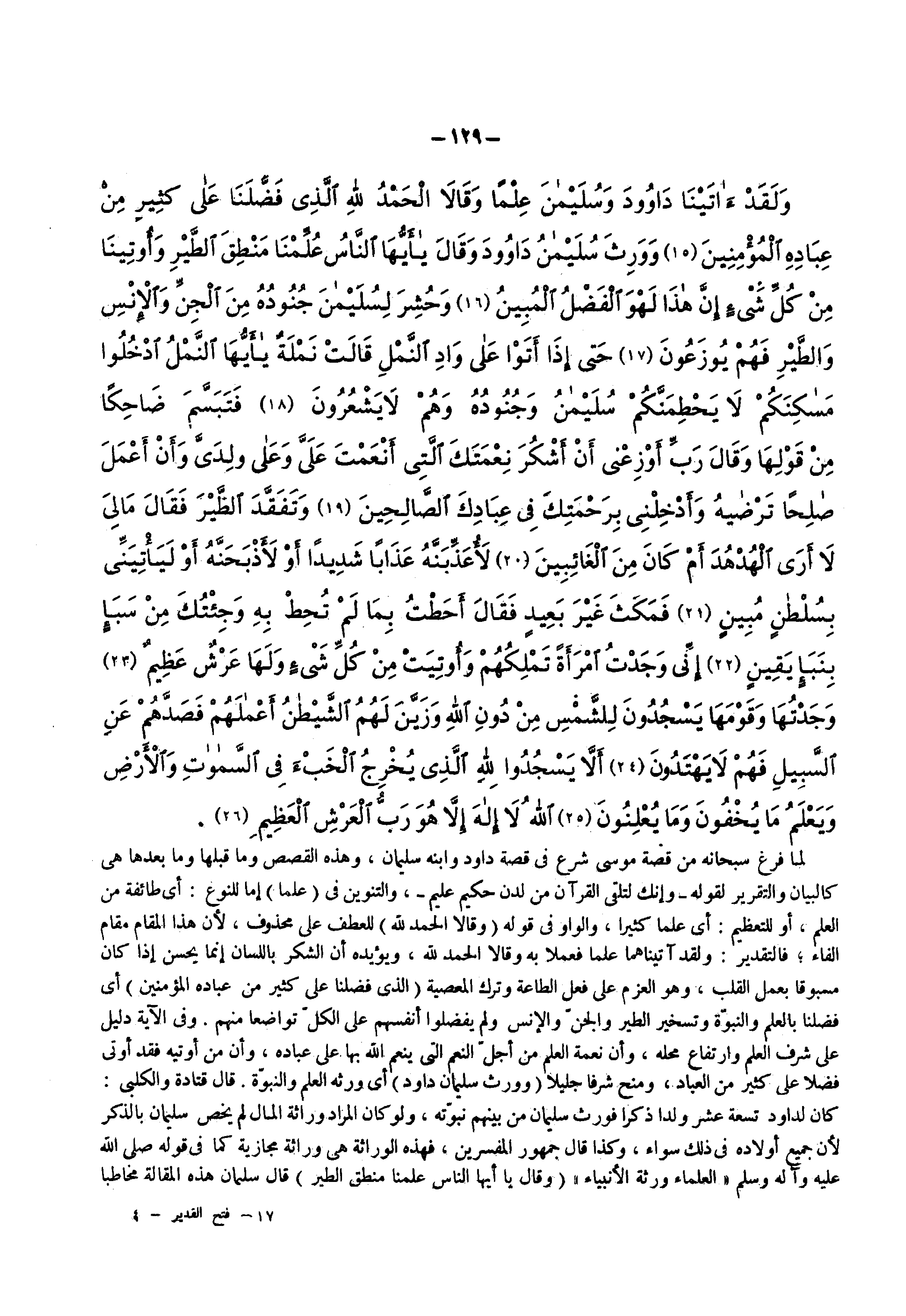 لما فرغ سبحانه من قصة موسى شرع فى قصة داود وابنه سليمان وهذه القصص وما قبلها وما بعدها هى كالبيان والتقرير لقوله ) وإنك لتلقى القرآن من لدن حكيم عليم ( والتنوين فى ) علما ( إما للنوع أى طائفة من العلم أو للتعظيم أى علما كثيرا والواو فى قوله ) وقالا الحمد لله ( للعطف علي محذوف لأن هذا المقام مقام الفاء فالتقدير ولقد آتيناهما علما فعملا به وقالا الحمد لله ويؤيده أن الشكر باللسان إنما يحسن إذا كان مسبوقا بعمل القلب وهو العزم على فعل الطاعة وترك المعصية ) الذي فضلنا على كثير من عباده المؤمنين ( أى فضلنا بالعلم والنبوة وتسخير الطير والجن والإنس ولم يفضلوا أنفسهم علي الكل تواضعا منهم وفى الاية دليل على شرف العلم وارتفاع محله وأن نعمة العلم من أجل النعم التى ينعم الله بها علي عباده وأن من أوتيه فقد أوتى فضلا علي كثير من العباد ومنح شرفا جليلا