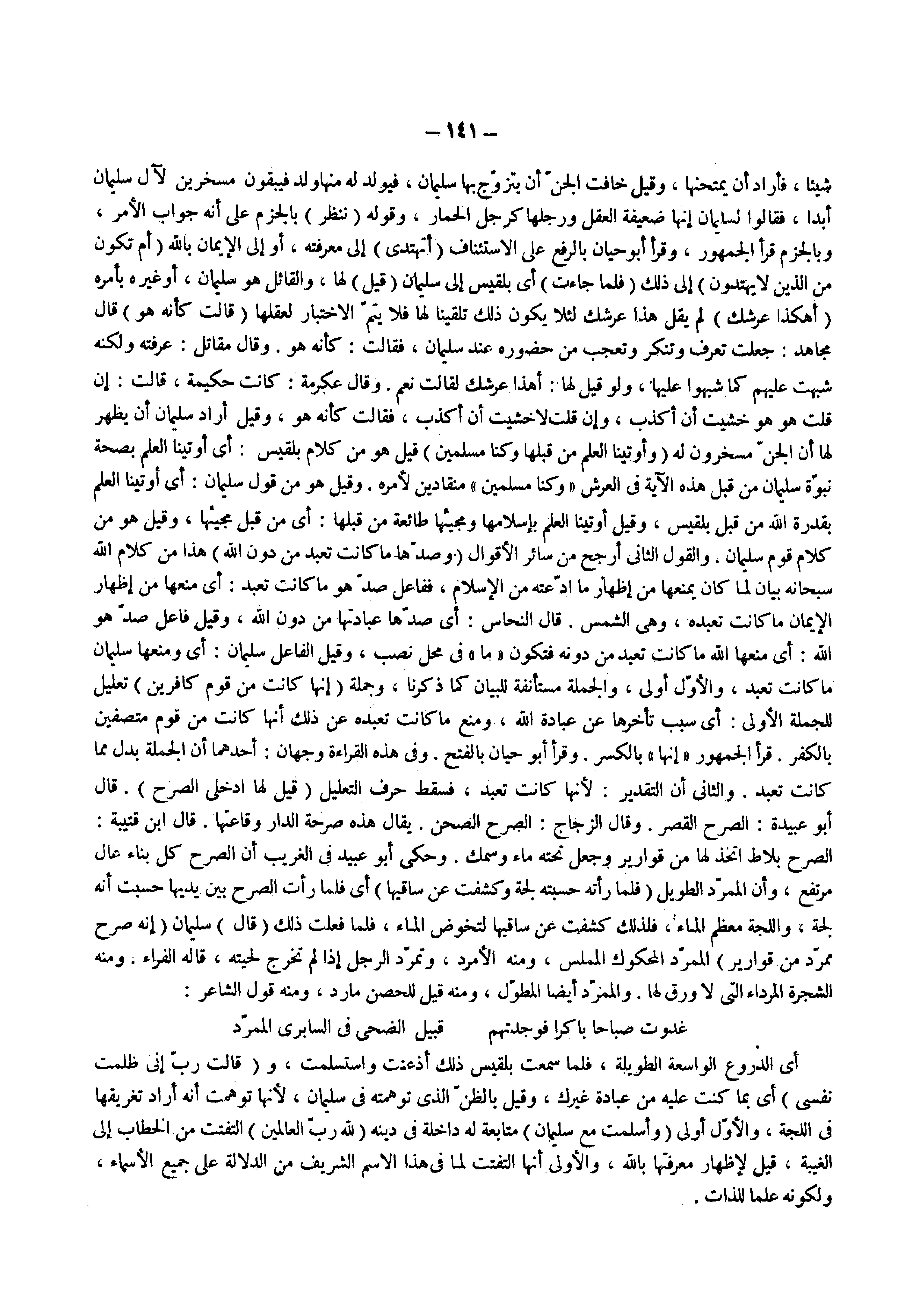 ) قيل لها ادخلي الصرح ( قال أبو عبيدة الصرح القصر وقال الزجاج الصرح الصحن يقال هذه صرحة الدار وقاعتها قال ابن قتيبة الصرح بلاط اتخذ لها من قوارير وجعل تحته ماء وسمك وحكى أبو عبيد في الغريب أن الصرح كل بناء عال مرتفع وأن الممرد الطويل ) فلما رأته حسبته لجة وكشفت عن ساقيها ( أي فلما رأت الصرح بين يديها حسبت أنه لجة واللجة معظم الماء فلذلك كشفت عن ساقيها لتخوض الماء فلما فعلت ذلك قال سليمان ) إنه صرح ممرد من قوارير ( الممرد المحكوك المملس ومنه الأمرد وتمرد الرجل إذا لم تخرج لحيته قاله الفراء ومنه الشجرة المرداء التي لا ورق لها والممرد أيضا المطول ومنه قيل للحصن ما رد ومنه قول الشاعر غدوت صباحا باكرا فوجدتهم