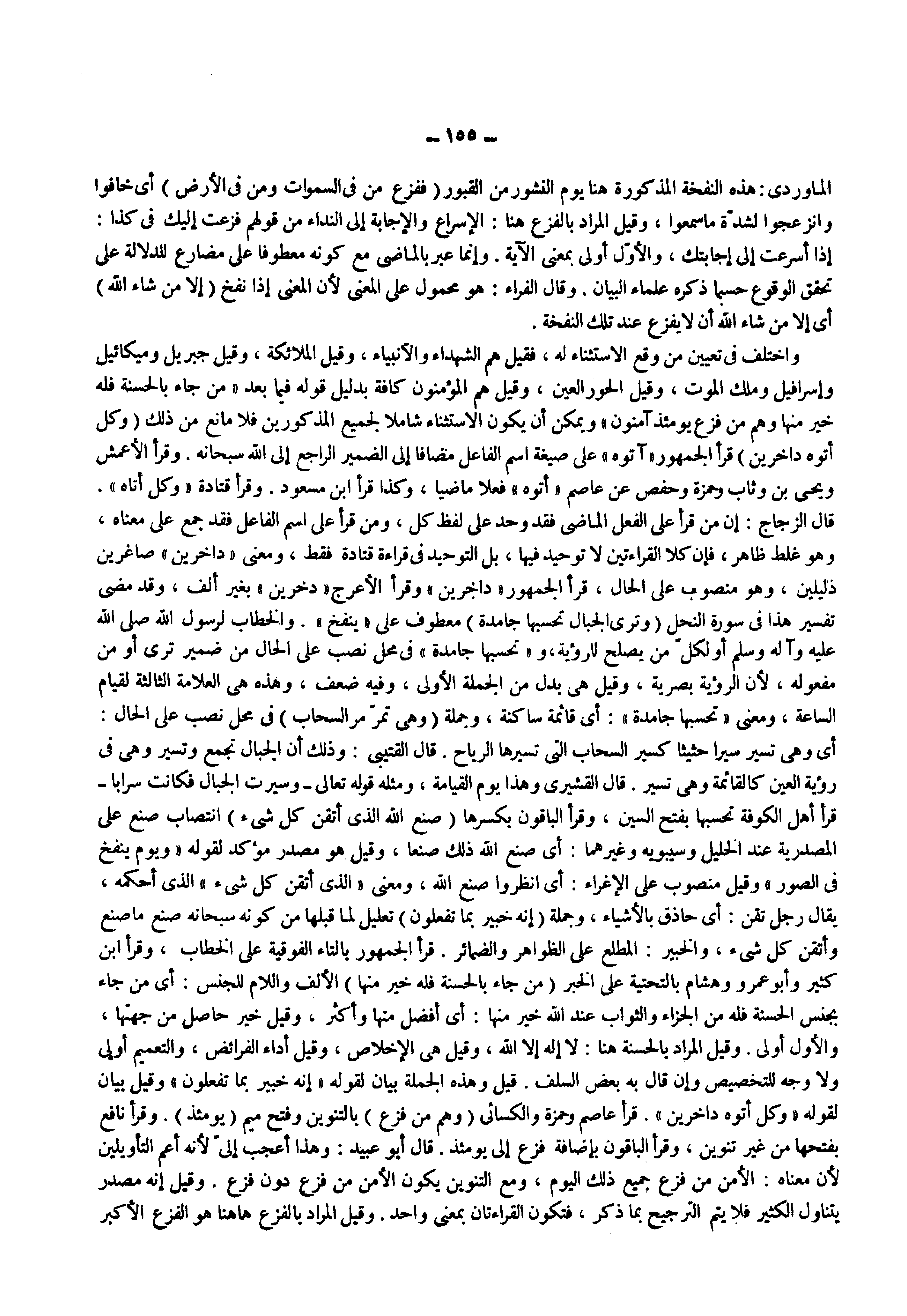 الماوردي هذه النفخة المذكورة هنا يوم النشور من القبور ) ففزع من في السماوات ومن في الأرض ( أي خافوا وانزعجوا لشدة ما سمعوا وقيل المراد بالفزع هنا الإسراع والإجابة إلى النداء من قولهم فزعت إليك في كذا إذا أسرعت إلى إجابتك والأول أولى بمعنى الاية وإنما عبر بالماضي مع كونه معطوفا على مضارع للدلالة على تحقق الوقوع حسبما ذكره علماء البيان وقال الفراء هو محمول على المعنى لأن المعنى إذا نفخ ) إلا من شاء الله ( أي إلا من شاء الله أن لا يفزع عند تلك النفخة