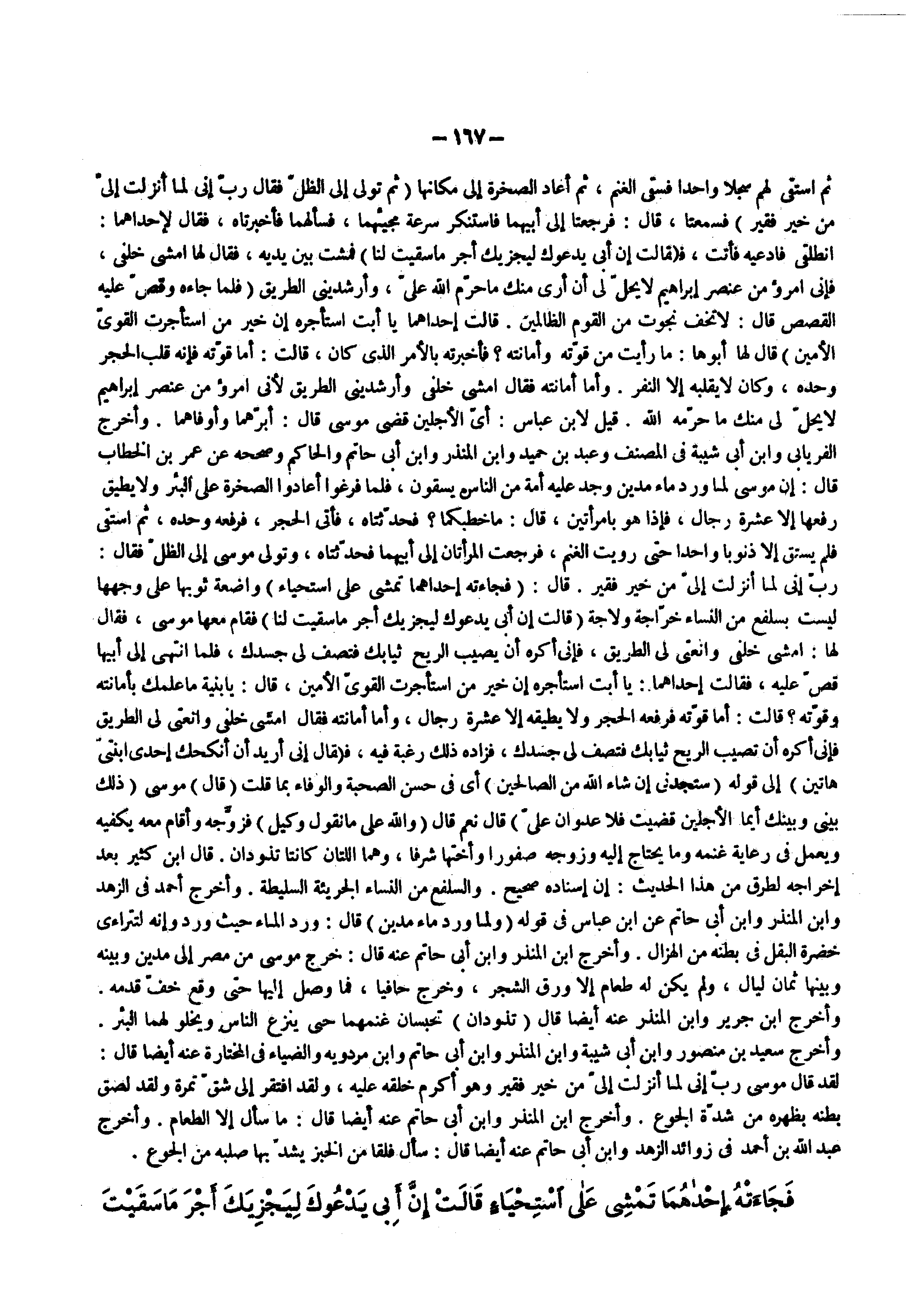 ثم استقى لهم سجلا واحدا فسقى الغنم ثم أعاد الصخرة إلى مكانها ) ثم تولى إلى الظل فقال رب إني لما أنزلت إلي من خير فقير ( فسمعتا قال فرجعتا إلى أبيهما فاستنكر سرعة مجيئهما فسألهما فأخبرتاه فقال لإحداهما انطلقى فادعيه فأتت فقالت إن أبي يدعوك ليجزيك أجر ما سقيت لنا فمشت بين يديه فقال لها امشي خلفي فإني امروء من عنصر إبراهيم لا يحل لي أن أرى منك ما حرم الله علي وأرشديني الطريق فلما جاءه وقص عليه القصص قال لا تخف نجوت من القوم الظالمين قالت إحداهما يا أبت استأجره إن خير من استأجرت القوي الأمين قال لها أبوها ما رأيت من قوته وأمانته فأخبرته بالأمر الذي كان قالت أما قوته فإنه قلب الحجر وحده وكان لا يقلبه إلا النفر وأما أمانته فقال امشى خلفى وأرشديني الطريق لأني امرؤ من عنصر إبراهيم لا يحل لي منك ما حرمه الله قيل لابن عباس أي الأجلين قضى موسى قال إبرهما وأوفاهما وأخرج الفريابي وابن أبي شيبة في المصنف وعبد بن حميد وابن المنذر وابن أبي حاتم والحاكم وصححه عن عمر بن الخطاب قال إن موسى لما ورد ماء مدين وجد عليه أمة من الناس يسقون فلما فرغوا أعاداوا الصخرة على البئر ولا يطيق رفعها إلا عشرة رجال فإذا هو بامرأتين قال ما خطبكما فحدثناه فأتى الحجر فرفعه وحده ثم استقى فلم يستق إلا ذنوبا واحدا حتى رويت الغنم فرجعت المرأتان إلى أبيهما فحدثتاه وتولى موسى إلى الظل فقال رب إني لما أنزلت إلى من خير فقير قال ) فجاءته إحداهما تمشي على استحياء ( واضعة ثوبها على وجهها ليست بسلفع من النساء خراجة ولاجة قالت إن أبي يدعوك ليجزيك أجر ما سقيت لنا فقام معها موسى فقال لها امشي خلفي وانعتي لي الطريق فإني أكره أن يصيب الريح ثيابك فتصف لي جسدك فلما انتهى إلى أبيها قص عليه فقالت إحداهما يا أبت استأجره إن خير من استأجرت القوي الأمين قال يا بنية ما علمك بأمانته وقوته قالت أما قوته فرفعه الحجر ولا يطيقه إلا عشرة رجال وأما أمانته فقال امشي خلفي وانعتي لي الطريق فإني أكره أن تصيب الريح ثيابك فتصف لي جسدك فزاده ذلك رغبة فيه فقال إني أريد أن أنكحك إحدى ابنتي هاتين إلى قوله ) ستجدني إن شاء الله من الصالحين ( أي في حسن الصحبة والوفاء بما قلت قال موسى ذلك بيني وبينك أيما الأجلين قضيت فلا عدوان علي قال نعم قال والله على ما نقول وكيل فزوجه وأقام معه يكفيه ويعمل في رعاية غنمه وما يحتاج إليه وزوجه صفورا وأختها شرفا وهما اللتان كانتا تذودان قال ابن كثير بعد إخراجه لطرق من هذا الحديث إن إسناده صحيح والسلفع من النساء الجريئة السليطة وأخرج أحمد في الزهد وابن المنذر وابن أبي حاتم عن ابن عباس في قوله ولما ورد ماء مدين قال ورد الماء حيث ورد وإنه لتتراءى خضرة البقل في بطنه من الهزال وأخرج ابن المنذر وابن أبي حاتم عنه قال خرج موسى من مصر إلى مدين وبينه وبينها ثمان ليال ولم يكن له طعام إلا ورق الشجر وخرج حافيا فما وصل إليها حتى وقع خف قدمه وأخرج ابن جرير وابن المنذر عنه أيضا قال تذودان تحسبان غنمهما حتى ينزع الناس ويخلو لهما البئر وأخرج سعيد بن منصور وابن أبي شيبة وابن المنذر وابن أبي حاتم وابن مردويه والضياء في المختارة عنه أيضا قال لقد قال موسى رب إني لما أنزلت إلى من خير فقير وهو أكرم خلقه عليه ولقد افتقر إلى شق تمرة ولقد لصق بطنه بظهره من شدة الجوع وأخرج ابن المنذر وابن أبي حاتم عنه أيضا قال ما سأل إلا طعام وأخرج عبد الله بن أحمد في زوائد الزهد وابن أبي حاتم عنه أيضا قال سأل فلقا من الخبر يشد بها صلبه من الجوع