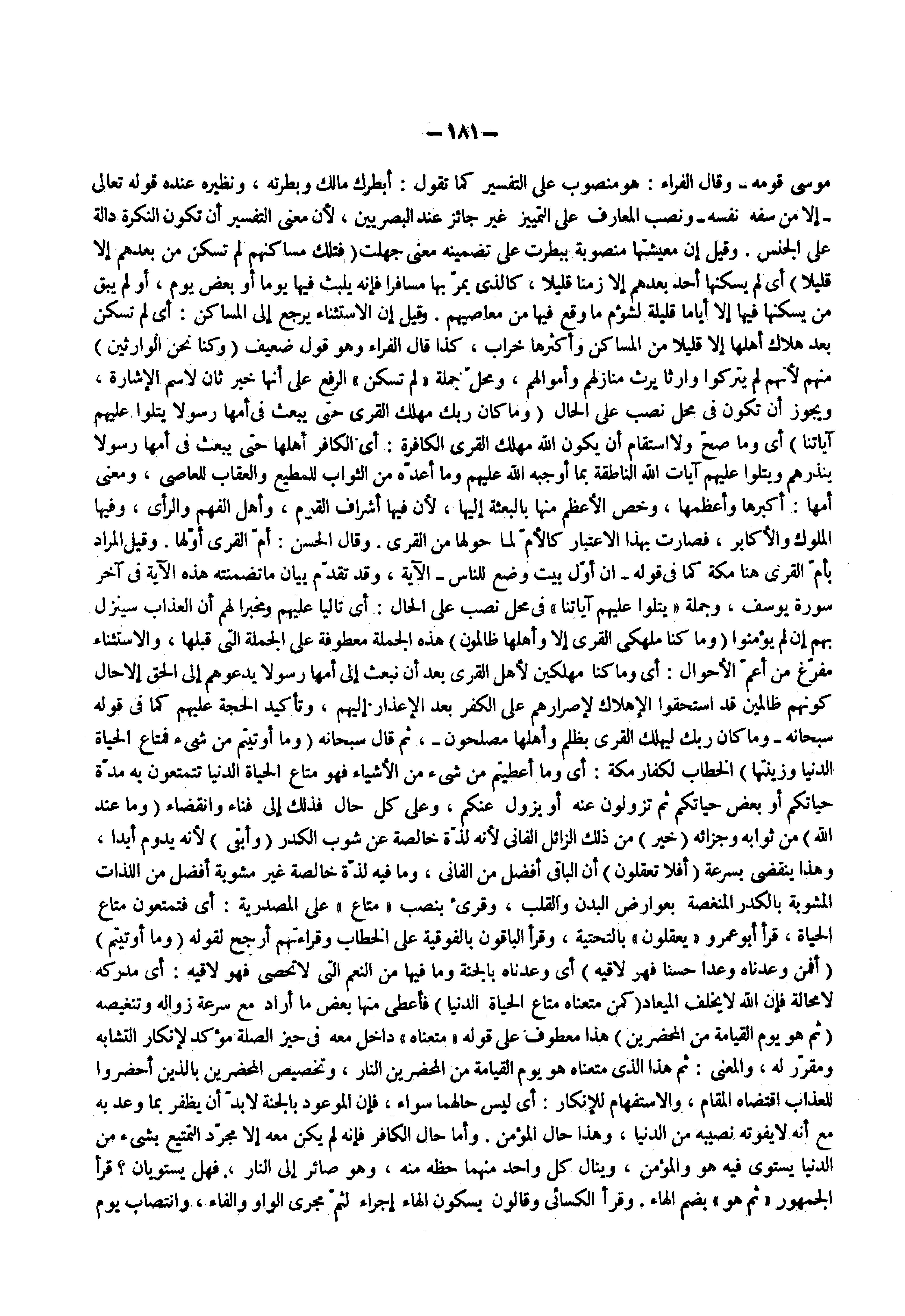 موسى قومه وقال الفراء هو منصوب على التفسير كما تقول أبطرك مالك وبطرته ونظيره عنده قوله تعالى ) إلا من سفه نفسه ( ونصب المعارف على التمييز غير جائز عند البصريين لأن معنى التفسير أن تكون النكرة دالة على الجنس وقيل إن معيشتها منصوبة ببطرت على تضمينه معنى جهلت فتلك مساكنهم لم تسكن من بعدهم إلا قليلا أي لم يسكنها أحد بعدهم إلا زمنا قليلا كالذي يمر بها مسافرا فإنه يلبث فيها يوما أو بعض يوم أو لم يبق من يسكنها فيها إلا أياما قليلة لشؤم ما وقع فيها من معاصيهم وقيل إن الاستثناء يرجع إلى المساكن أي لم تسكن بعد هلاك أهلها إلا قليلا من المساكن وأكثرها خراب كذا قال الفراء وهو قول ضعيف وكنا نحن الوارثين منهم لأنهم لم يتركوا وارثا يرث منازلهم وأموالهم ومحل جملة لم تسكن الرفع على أنها خبر ثان لاسم الإشارة ويجوز أن تكون في محل نصب على الحال