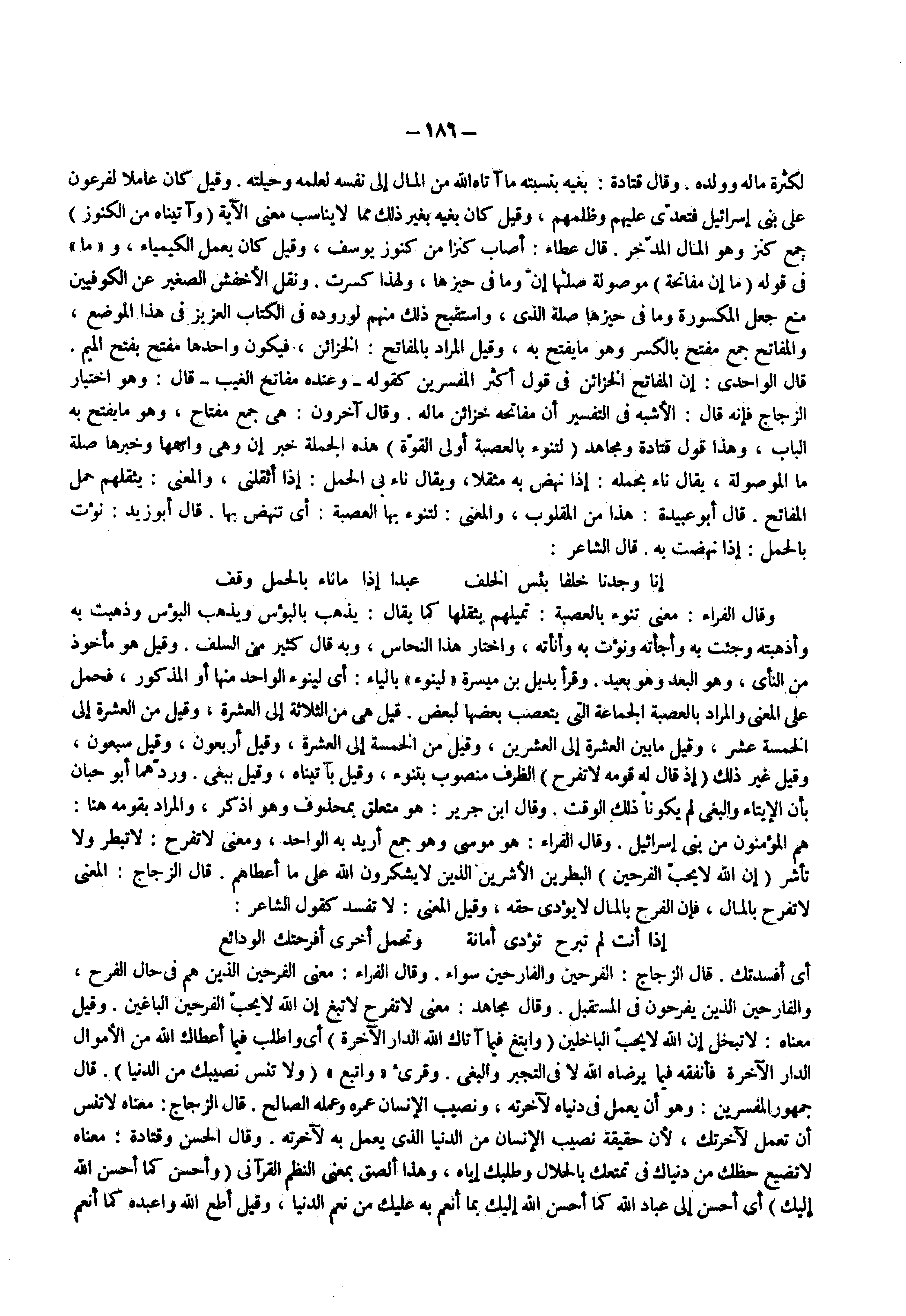 وقال الفراء معنى تنوء بالعصبة تميلهم يثقلها كما يقال يذهب بالبؤس ويذهب البؤس وذهبت به وأذهبته وجئت به وأجأته ونؤت به وأنأته واختار هذا النحاس وبه قال كثير من السلف وقيل هو مأخوذ من النأي وهو البعد وهو بعيد وقرأ بديل بن ميسرة لينوء بالياء أي لينوء الواحد منها أو المذكور فحمل على المعنى والمراد بالعصبة الجماعة التي يتعصب بعضها لبعض قيل هي من الثلاثة إلى العشرة وقيل من العشرة إلى الخمسة عشر وقيل ما بين العشرة إلى العشرين وقيل من الخمسة إلى العشرة وقيل أربعون وقيل سبعون وقيل غير ذلك ) إذ قال له قومه لا تفرح ( الظرف منصوب بتنوء وقيل بآتيناه وقيل ببغى وردهما أبو حبان بأن الإيتاء والبغي لم يكونا ذلك الوقت وقال ابن جرير هو متعلق بمحذوف وهو اذكر والمراد بقومه هنا هم المؤمنون من بني إسرائيل وقال الفراء هو موسى وهو جمع أريد به الواحد ومعنى لا تفرح لا تبطر ولا تأشر ) إن الله لا يحب الفرحين ( البطرين الأشرين الذين لا يشكرون الله على ما أعطاهم قال الزجاج المعنى لا تفرح بالمال فإن الفرح بالمال لا يؤدي حقه وقيل المعنى لا تفسد كقول الشاعر إذا أنت لم تبرح تؤدي أمانة